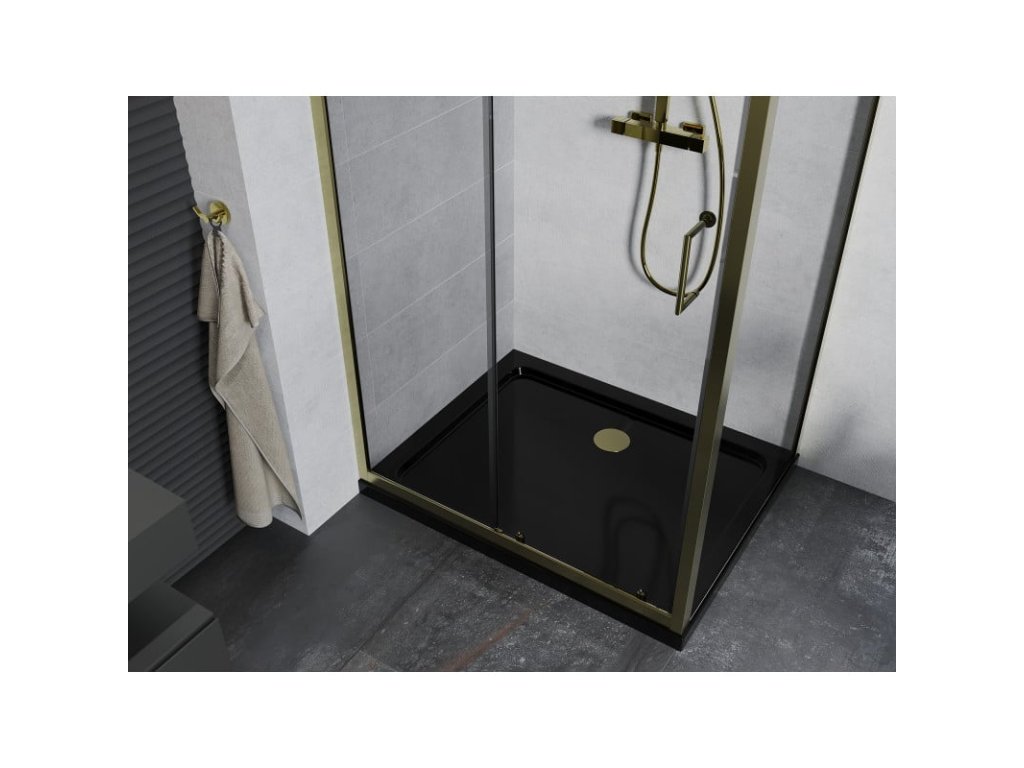 Mexen Apia sprchový kút posuvné dvere 140 x 90 cm, priehľadné sklo, profil zlatý + sprchová vanička Flat, čierna - 840-140-090-50-00-4070G
