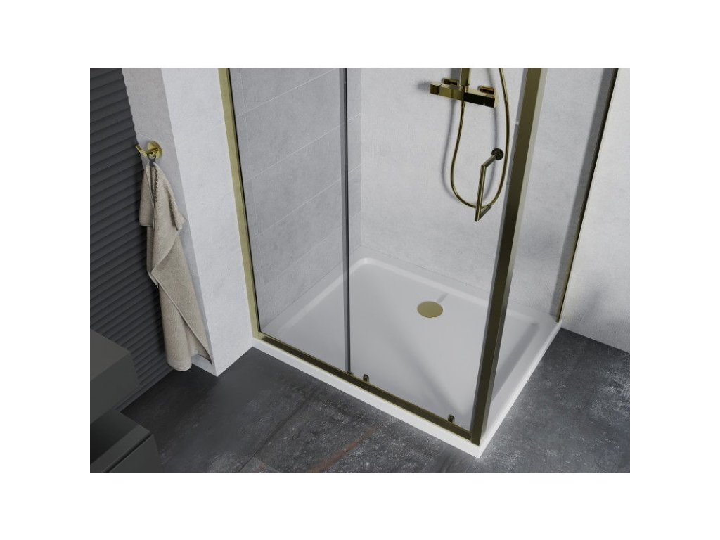 Mexen Apia sprchový kút posuvné dvere 90 x 80 cm, priehľadné sklo, profil zlatý + sprchová vanička Flat, biela- 840-090-080-50-00-4010G