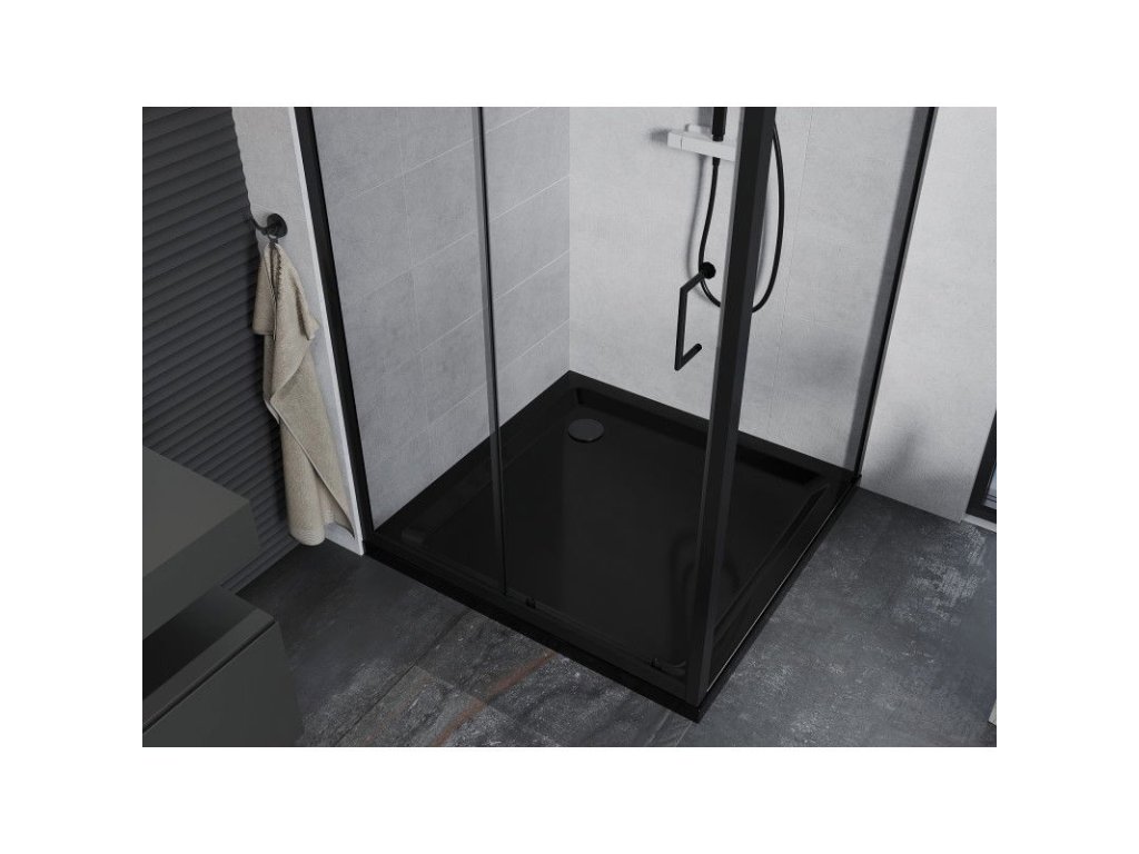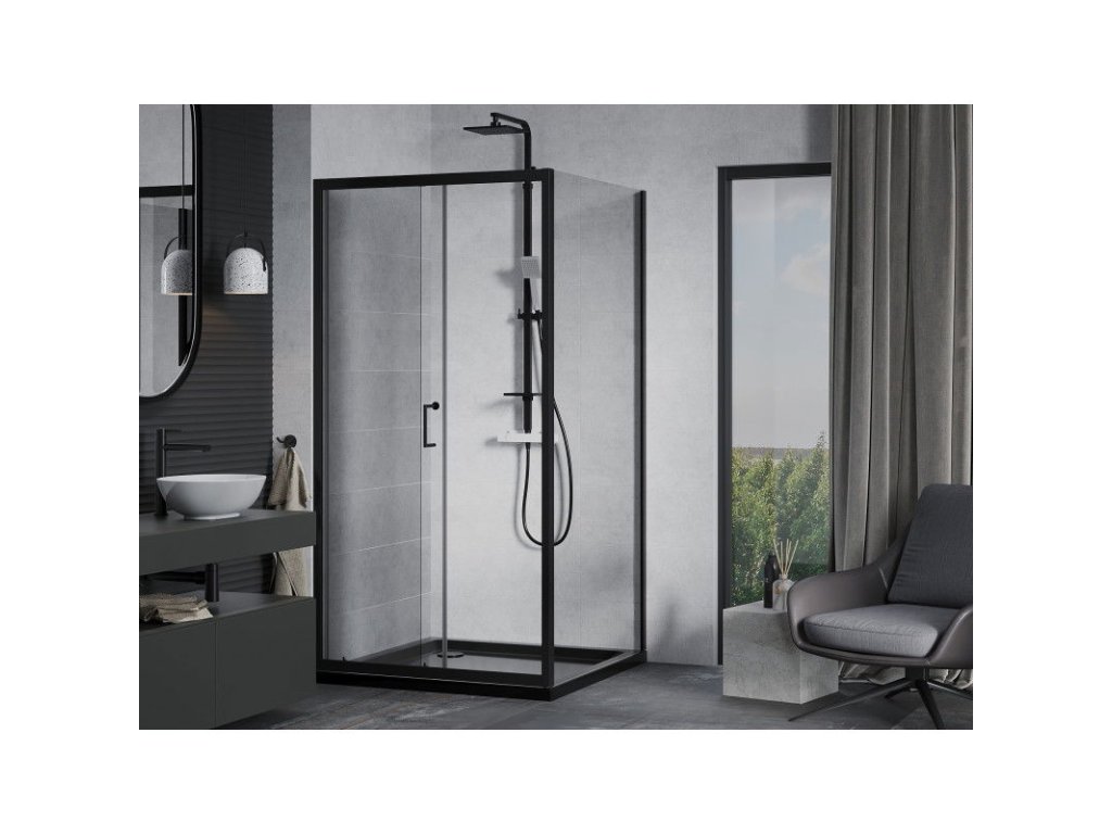 Mexen Apia sprchový kút posuvné dvere 90 x 90 cm, priehľadné sklo, profil čierny + sprchová vanička Flat, čierna - 840-090-090-70-00-4070B