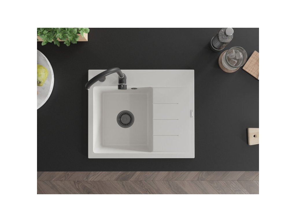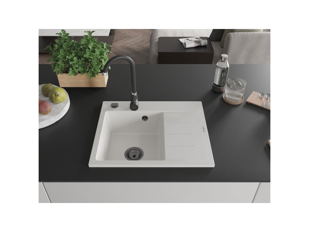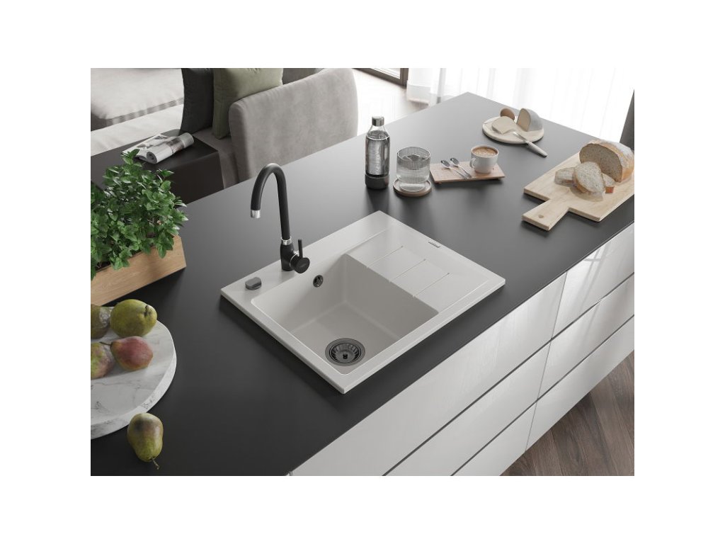 Mexen Ben 1-komorový granitový drez s odkapávačom vľavo 600 x 500 mm, biely, čierny sifón - 6522605000-20-B
