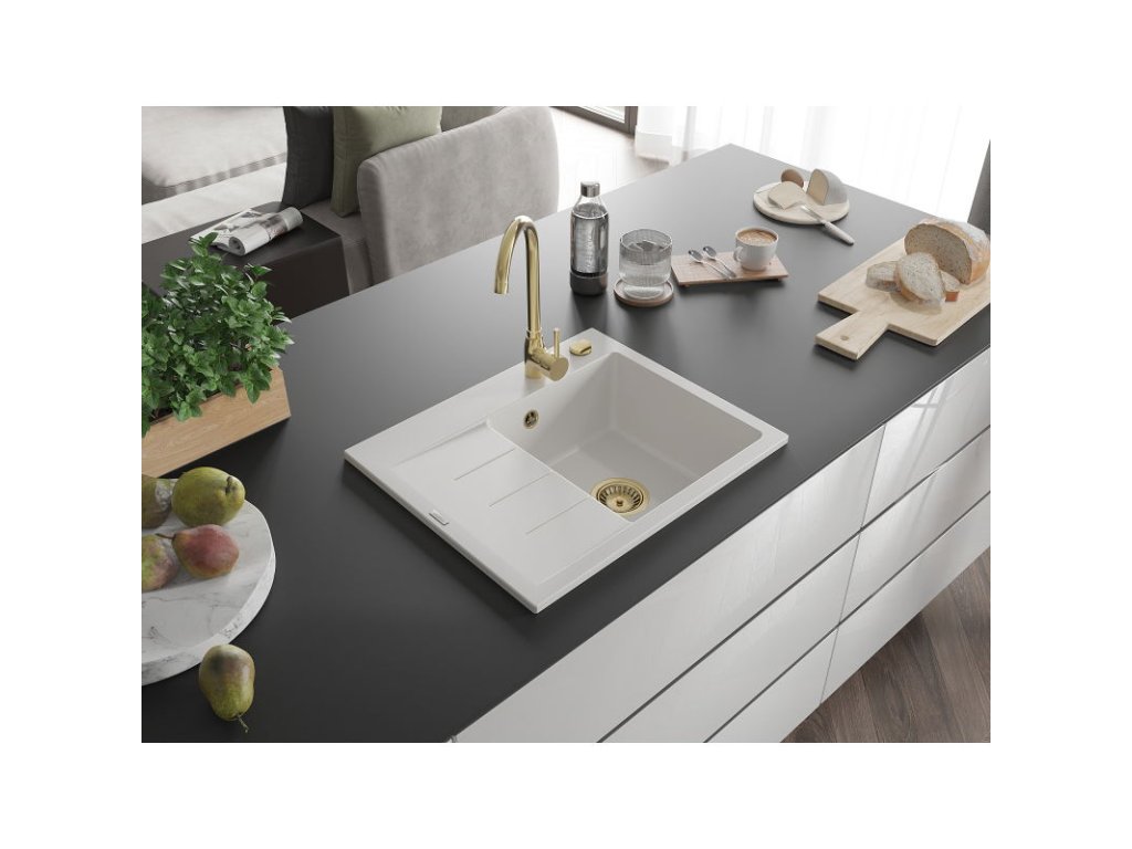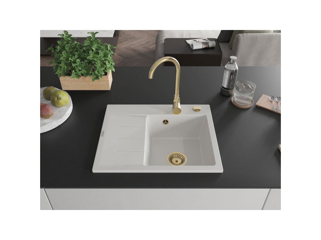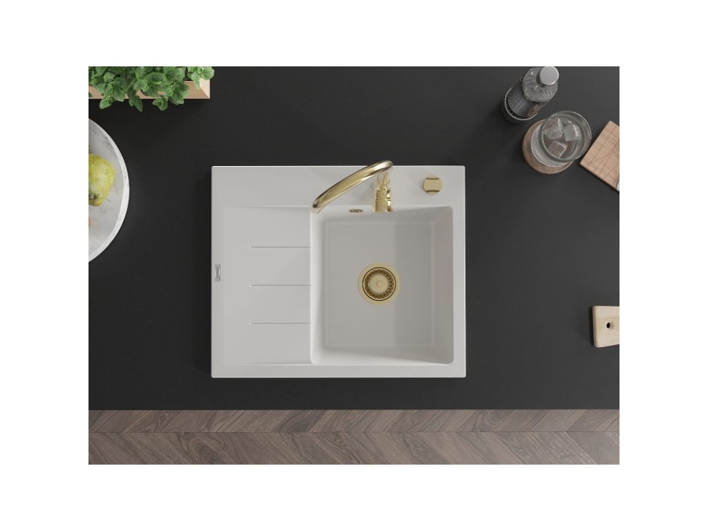Mexen Ben 1-komorový granitový drez s odkapávačom vpravo 600 x 500 mm, biely, zlatý sifón - 6523605000-20-G