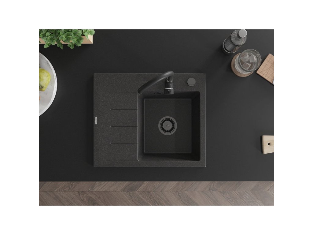 Mexen Ben 1-komorový granitový drez s odkapávačom vpravo 600 x 500 mm, čierny bodkovaný, čierny sifón - 6523605000-76-B