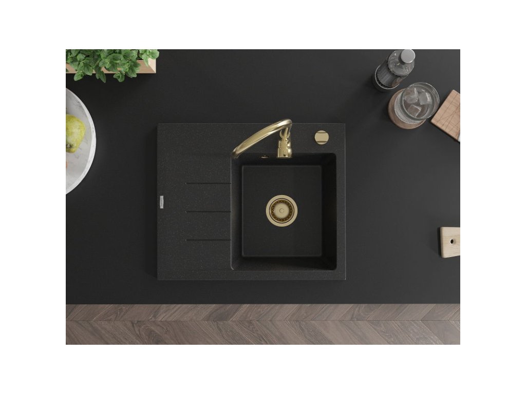 Mexen Ben 1-komorový granitový drez s odkapávačom vpravo 600 x 500 mm čierna/strieborná metalíza, zlatý sifón - 6523605000-73-G