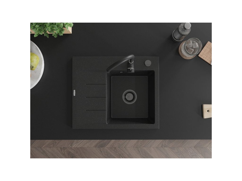 Mexen Ben 1-komorový granitový drez s odkapávačom vpravo 600 x 500 mm čierny/strieborný metalický sifón čierny - 6523605000-73-B