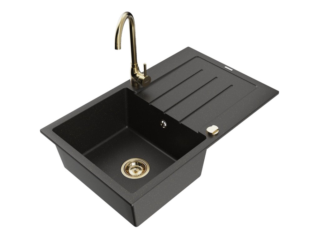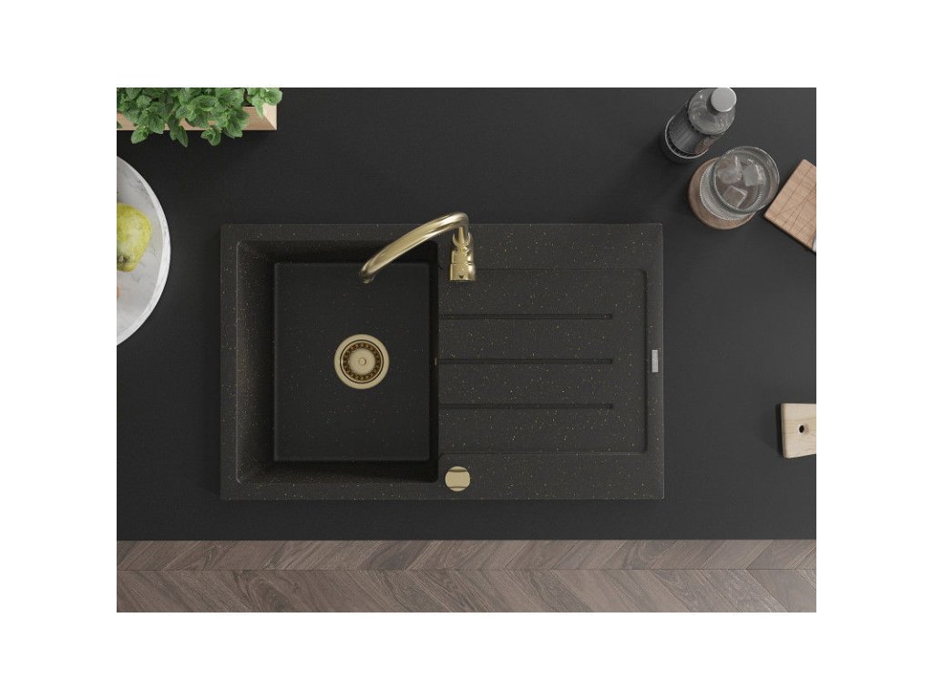 Mexen Bruno drez granitový 1-komorový s odkvapkávačom + batéria Telma, čierny/zlatý - 6513-75-670200-50