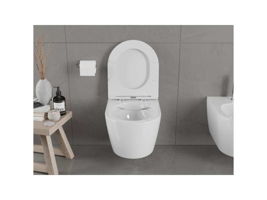 \n \n \nTechnické údaje: \n \nrozmery: 49x37x34 cm \n \ninštalácia: závesná \n \nsplachovací systém: Rimless (bez okrajov) \n \nfarba: biela \n \nmateriál: sanitárna keramika \n \ntyp dosky: pomaly padajúca \n \nfarba: biela \n \nmateriál: tvrdený plast \n \nSLIM verzia: áno \n \njednoduché uvoľnenie: áno \n \nkovové pánty: ánoDodatočné parametre