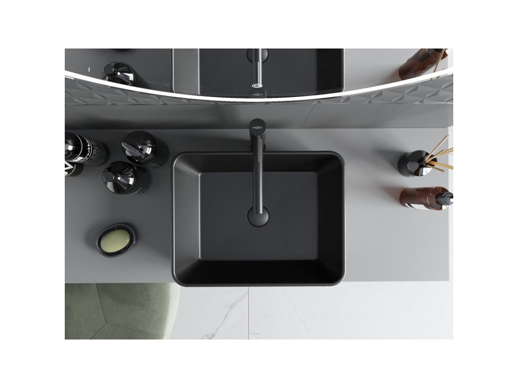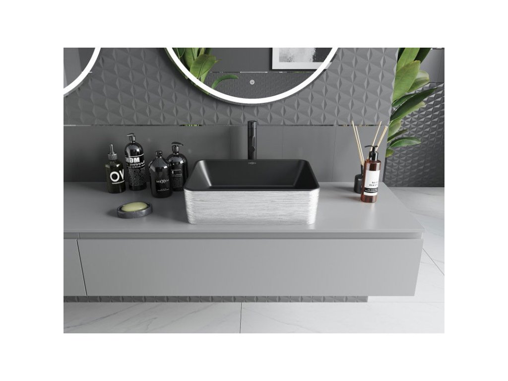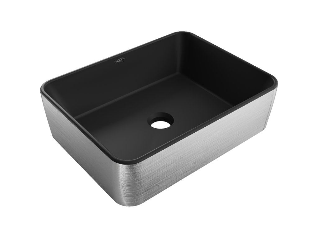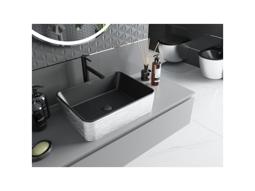 Mexen Catia je elegantné umývadlo na dosku s rozmermi 48 x 37 cm, ktoré je k dispozícii v štýlovej čiernej matnej farbe so strieborným lineárnym vzorom. Je vyrobené zo sanitárnej keramiky, má obdĺžnikový tvar a matný povrch pre moderný vzhľad. Vďaka absencii otvorov pre batériu a prepad je ideálne pre minimalistické usporiadanie. Ochranný povlak zaručuje dlhodobé používanie, takže je vynikajúcou voľbou pre tých, ktorí ocenia estetické kvality aj funkčnosť.Dodatočné parametre