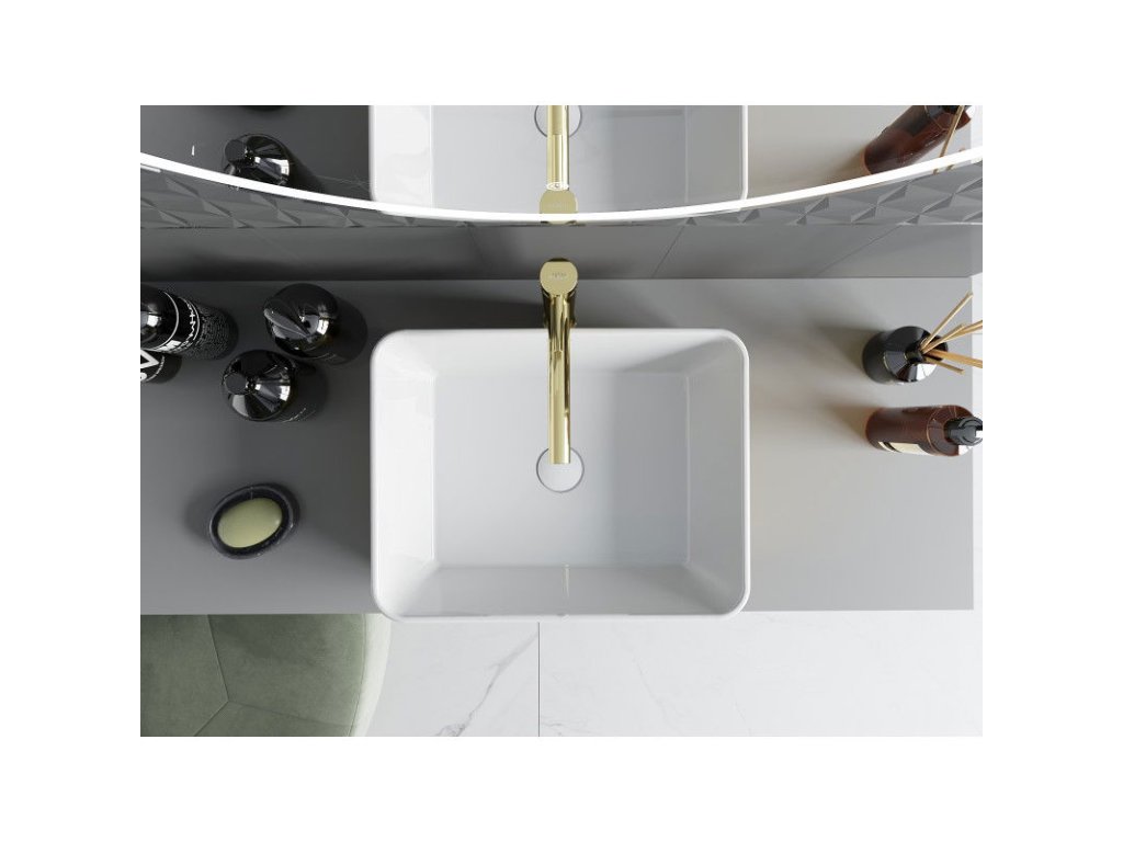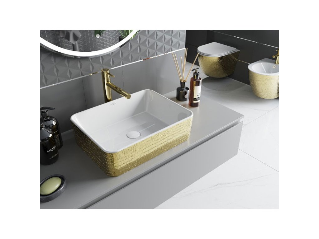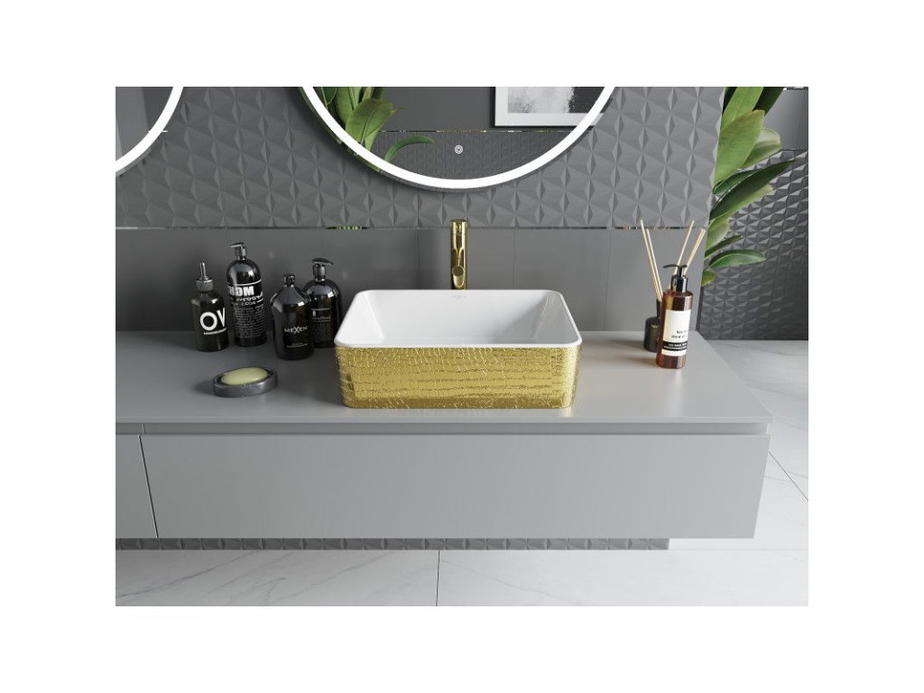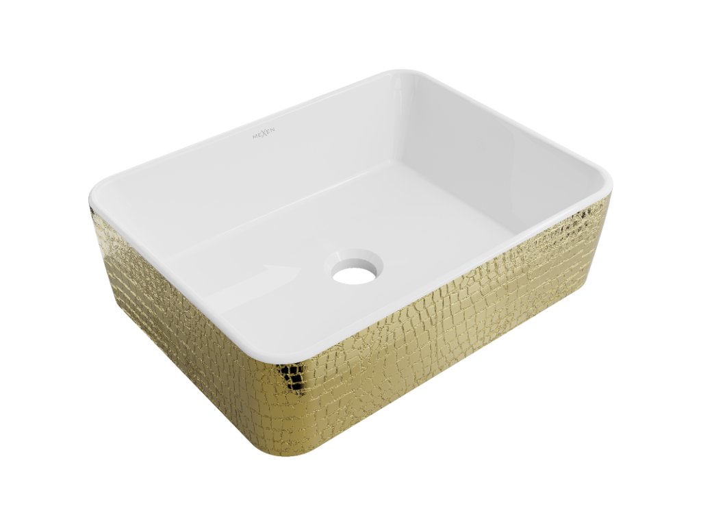 Mexen Catia je elegantné umývadlo na dosku s rozmermi 48 x 38 cm, vyrobené zo sanitárnej keramiky, ktoré spája estetiku a funkčnosť. Jeho bielo-zlatý vrúbkovaný vzor dodá kúpeľni jedinečný charakter, zatiaľ čo obdĺžnikový tvar dodáva moderný nádych. Vďaka matnému povrchu a ochrannej vrstve sa umývadlo ľahko čistí a je odolné proti poškriabaniu. Bez otvorov na batériu alebo prepadu má elegantný vzhľad, ktorý je ideálny pre minimalistický interiér.Diskusia