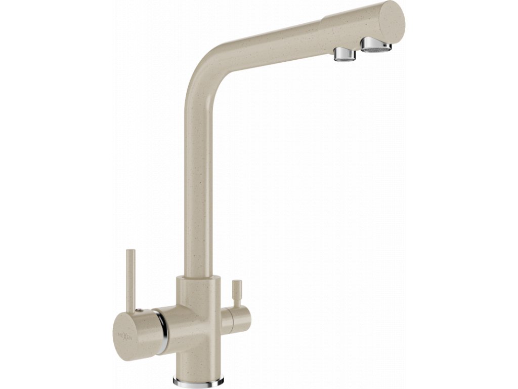 \n \n \nTechnické údaje: \n \nmateriál: mosadz \n \npovrchová úprava: béžová \n \nhlavice: keramické \n \nperlátor: áno \n \nrozsah výtoku: 235 mm \n \nvýška: 315 mm \n \ntyp: dvojvýtoková \n \ndvojhlavicová batéria s prídavným kanálom na filtrovanú pitnú voduDodatočné parametre
