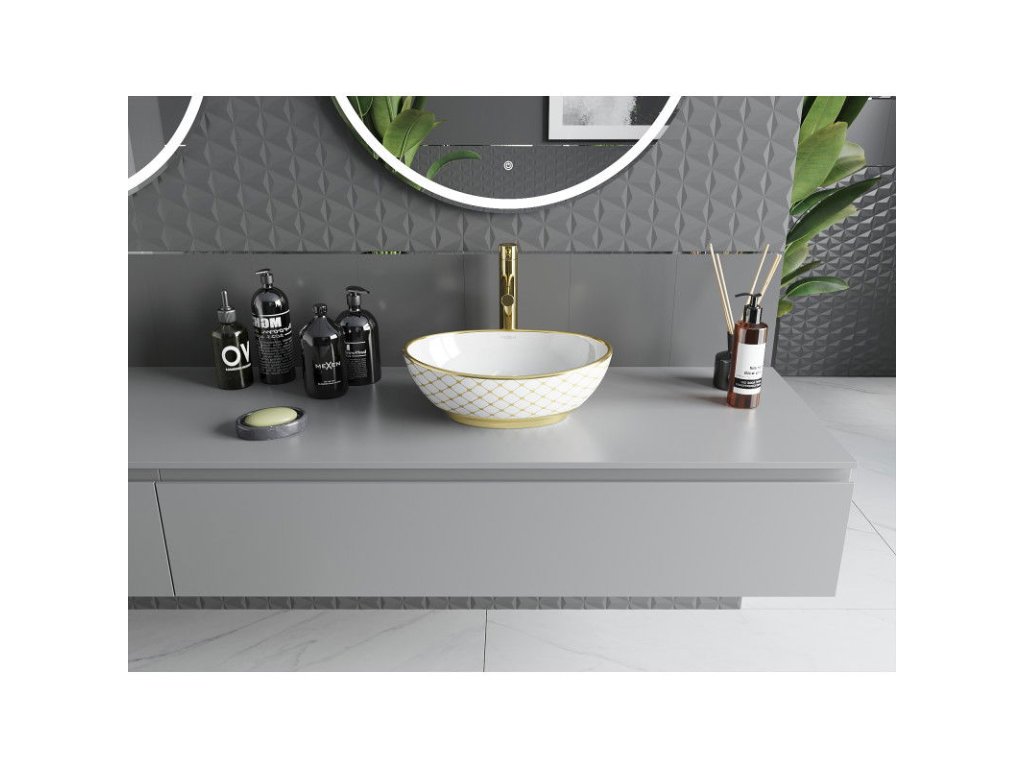 Doprajte si moderné a elegantné umývadlo na dosku, ktoré dodá vašej kúpeľni jedinečný štýl. Umývadlo s rozmermi 40,5 x 33 x 14 cm sa vyznačuje bielou keramikou so zlatým mriežkovým vzorom a lesklým povrchom. Vďaka oválnemu tvaru je nielen funkčné, ale aj estetické. Bez otvoru na prepad a bez priestoru na batériu dokonale zapadá do moderných trendov. Vďaka povrchu odolnému proti poškriabaniu je ideálnou voľbou pre tých, ktorí ocenia kvalitu a štýl.Dodatočné parametre