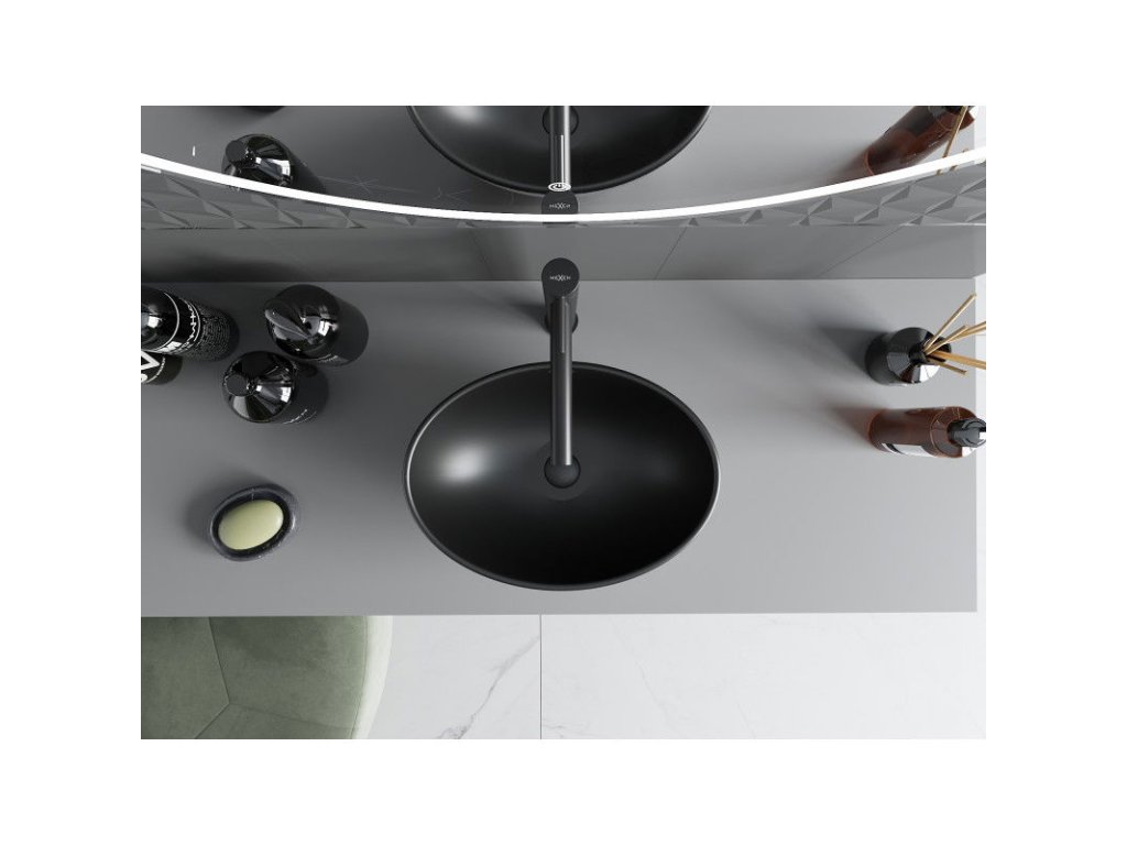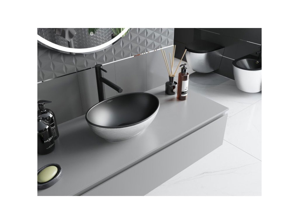 Umelá elegancia a moderný dizajn sú zárukou umývadla na doske. S rozmermi 40,5 x 33 x 14 cm a hĺbkou 12,5 cm výrobok dokonale zapadne do každej kúpeľne. Je vyrobené zo sanitárnej keramiky a má matný čierny povrch so strieborným vzorom, ktorý podčiarkuje jeho štýl. Absencia otvorov pre batériu a prepad zabezpečuje minimalistický vzhľad, zatiaľ čo ochranná vrstva zvyšuje odolnosť. Ideálna voľba pre tých, ktorí ocenia modernosť a funkčnosť.Dodatočné parametre