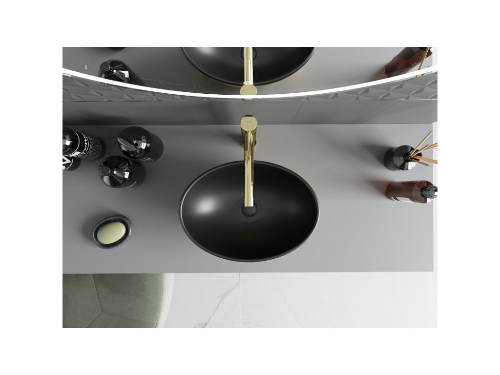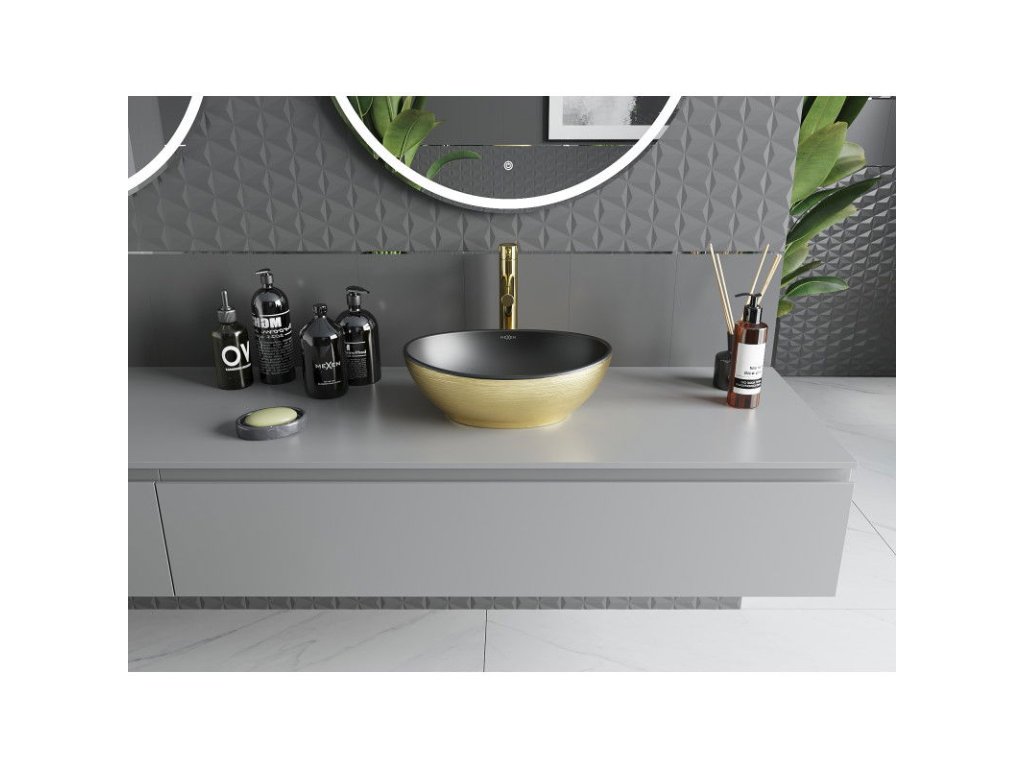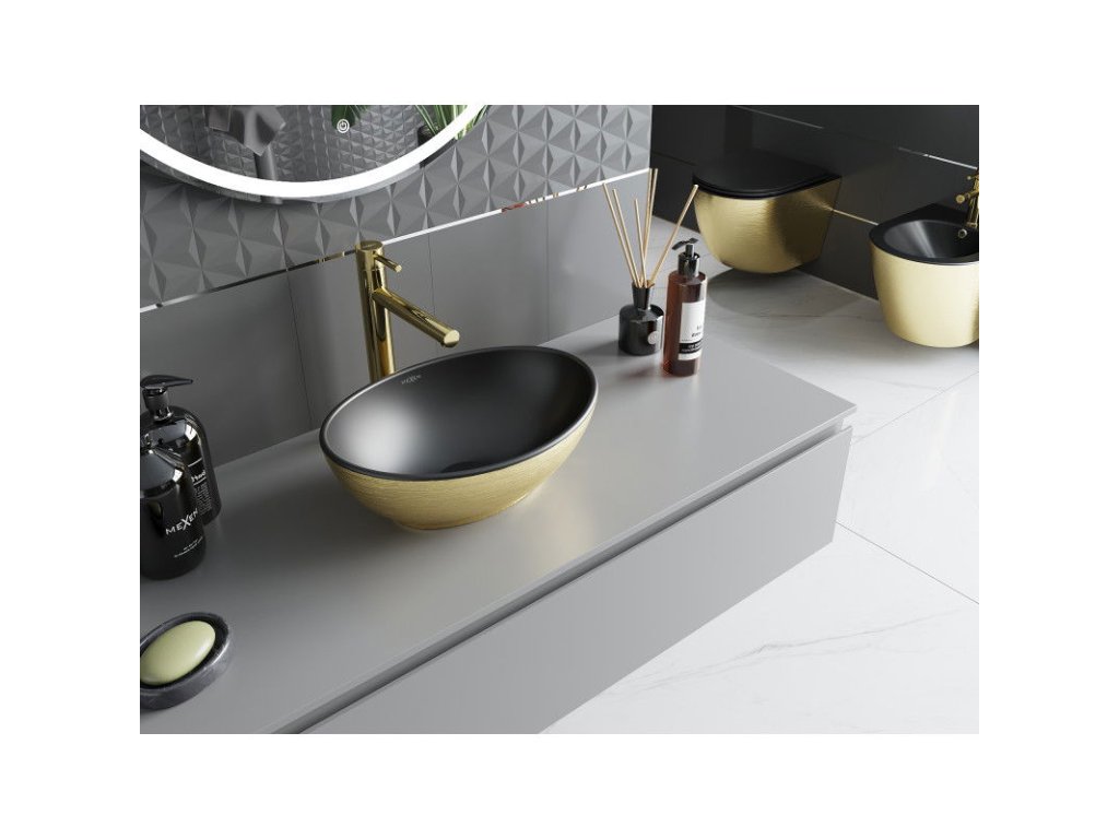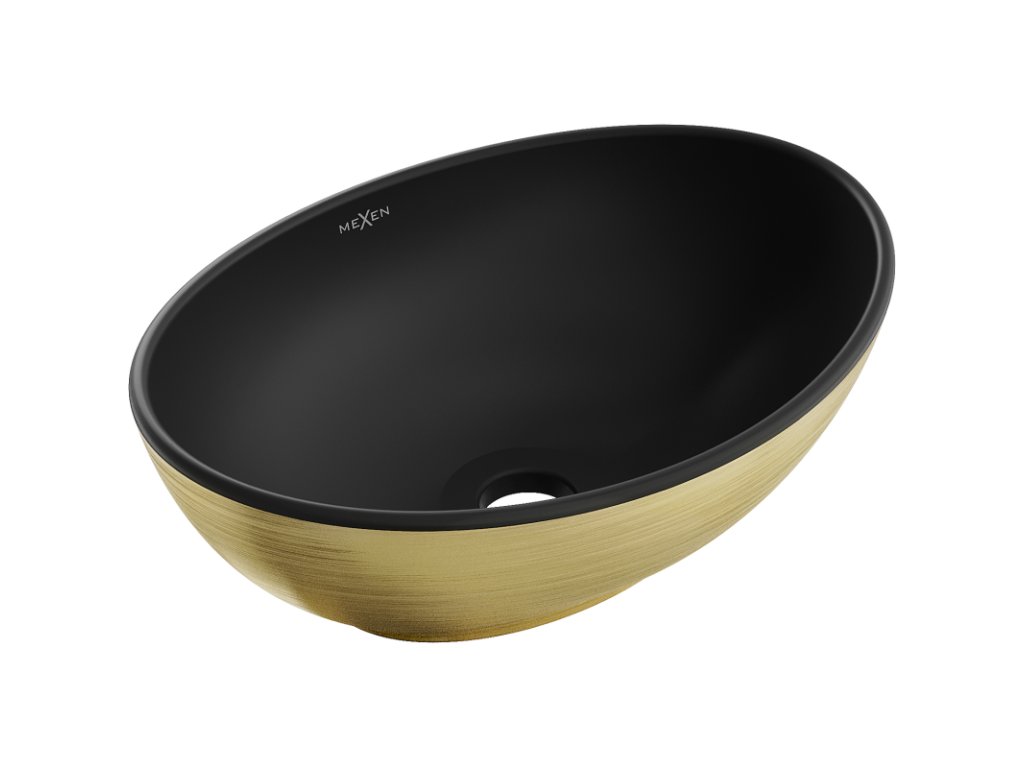 Mexen Elza je elegantné umývadlo na dosku s rozmermi 40,5 x 33 cm, vyrobené zo sanitárnej keramiky v štýlovej čiernej matnej farbe so zlatým vzorom. Jeho oválny tvar a hĺbka 12,5 cm zaručujú funkčnosť aj estetiku. Absencia prepadu a otvoru na batériu umocňuje jeho moderný dizajn. Umývadlo má dodatočnú ochrannú vrstvu, ktorá zdôrazňuje jeho odolnosť a jednoduché čistenie. Vynikajúca voľba do minimalistických interiérov s charakterom.Dodatočné parametre