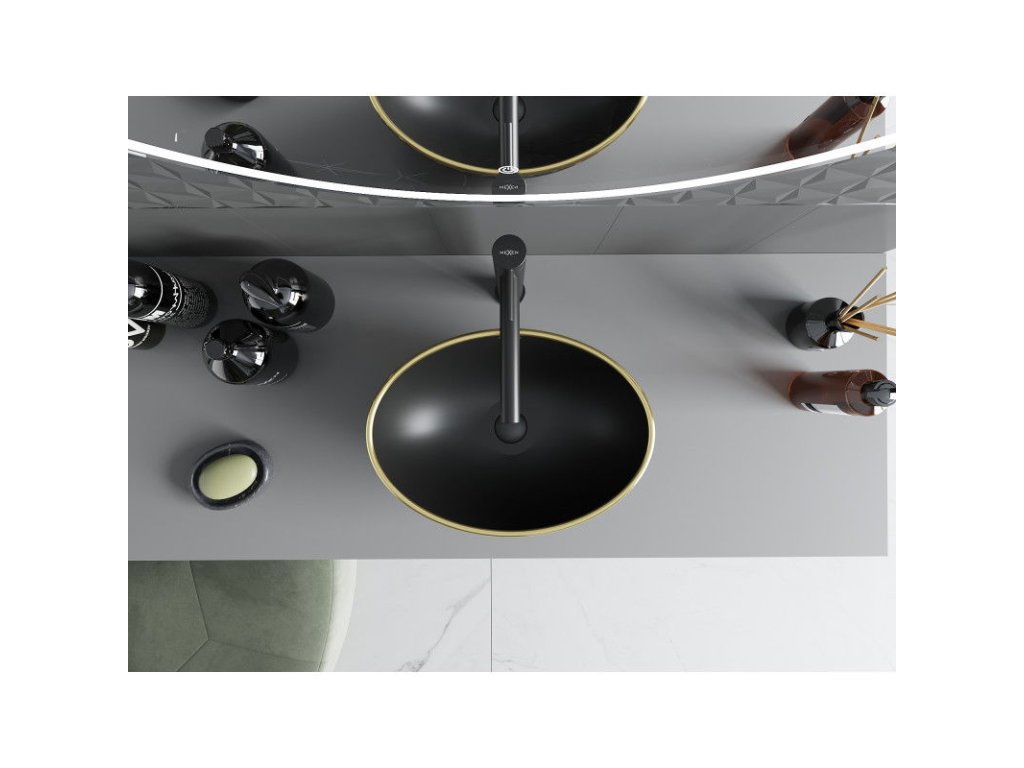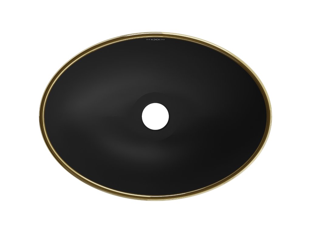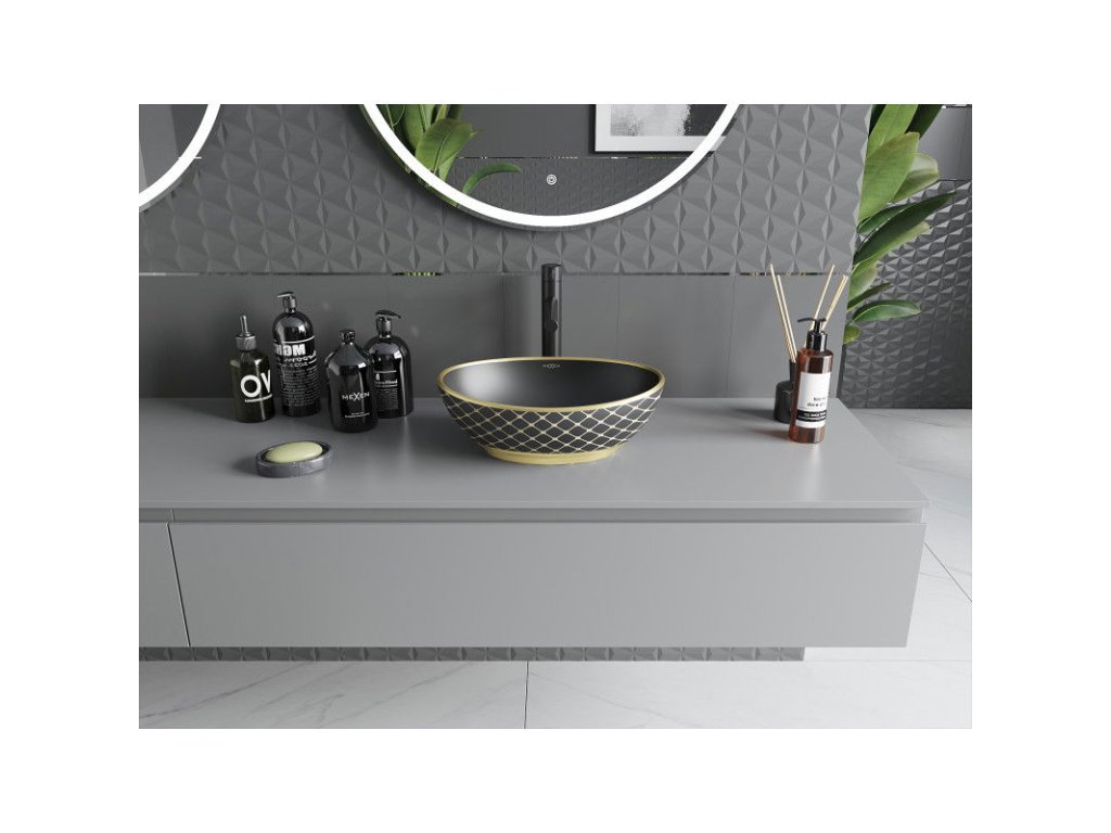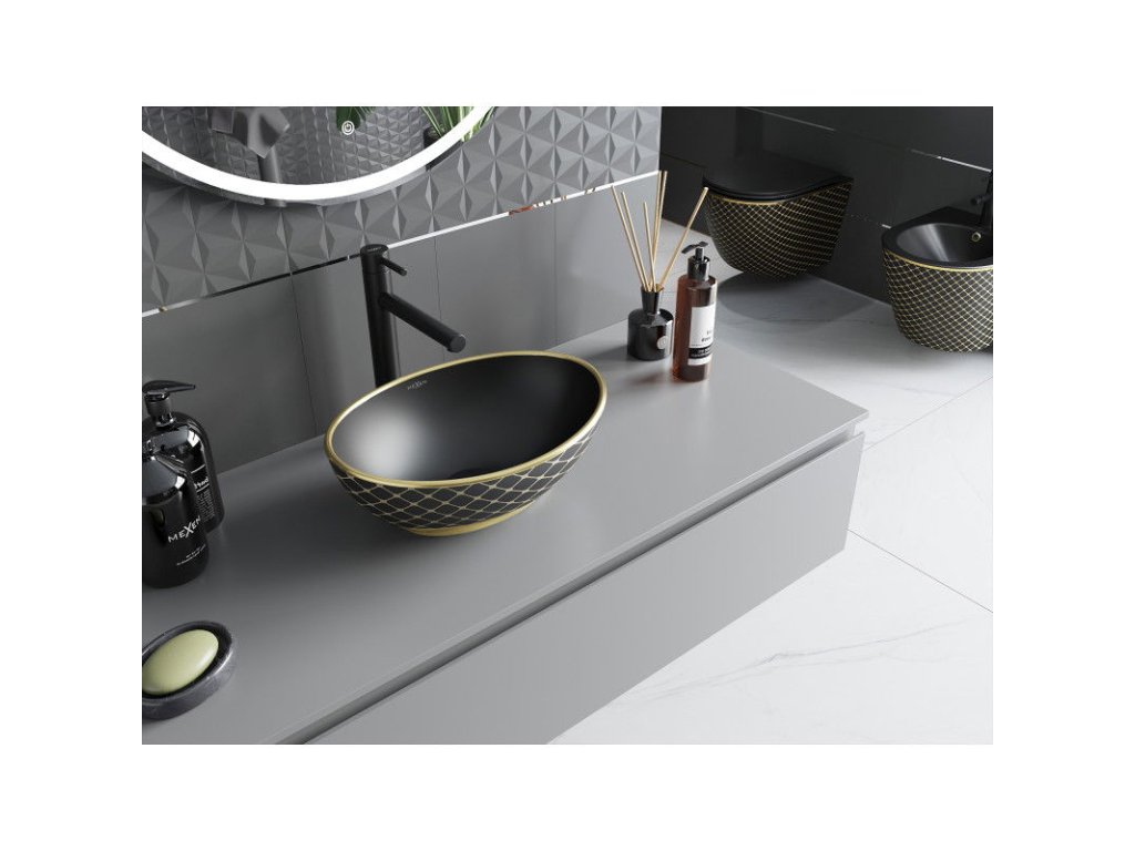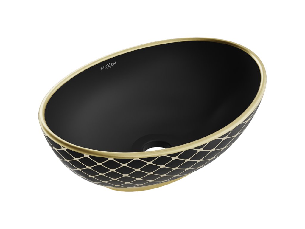 Mexen Elza je elegantné umývadlo na dosku s rozmermi 40,5 x 33 cm v čiernej matnej farbe so zlatým mriežkovým vzorom, ideálne do moderných kúpeľní. S hĺbkou 12,5 cm a oválnym tvarom zaručuje pohodlné používanie. Je vyrobené zo sanitárnej keramiky a vyznačuje sa ochranným povrchom, vďaka ktorému sa ľahko udržiava v čistote. Vďaka absencii otvorov pre batériu a prepad je univerzálna a estetická, dokonale sa hodí do rôznych usporiadaní. Keď investujete do batérie Mexen Elza, vyberáte si kvalitu a štýl.Dodatočné parametre