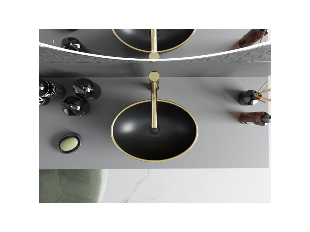 Objavte eleganciu a modernosť s umývadlom na dosku Elza od spoločnosti Mexen. Je vyrobené z odolnej sanitárnej keramiky, má matnú čiernu povrchovú úpravu a zlatý okraj, ktorý vnesie do každej kúpeľne nádych luxusu. Vďaka kompaktným rozmerom 40,5 x 33 cm a hĺbke 12,5 cm je ideálne do menších priestorov. Okrem toho absencia otvoru na kohútik a prepadu ešte viac zdôrazňuje minimalistický dizajn, vďaka čomu je ideálnou voľbou do moderného prostredia.Dodatočné parametre