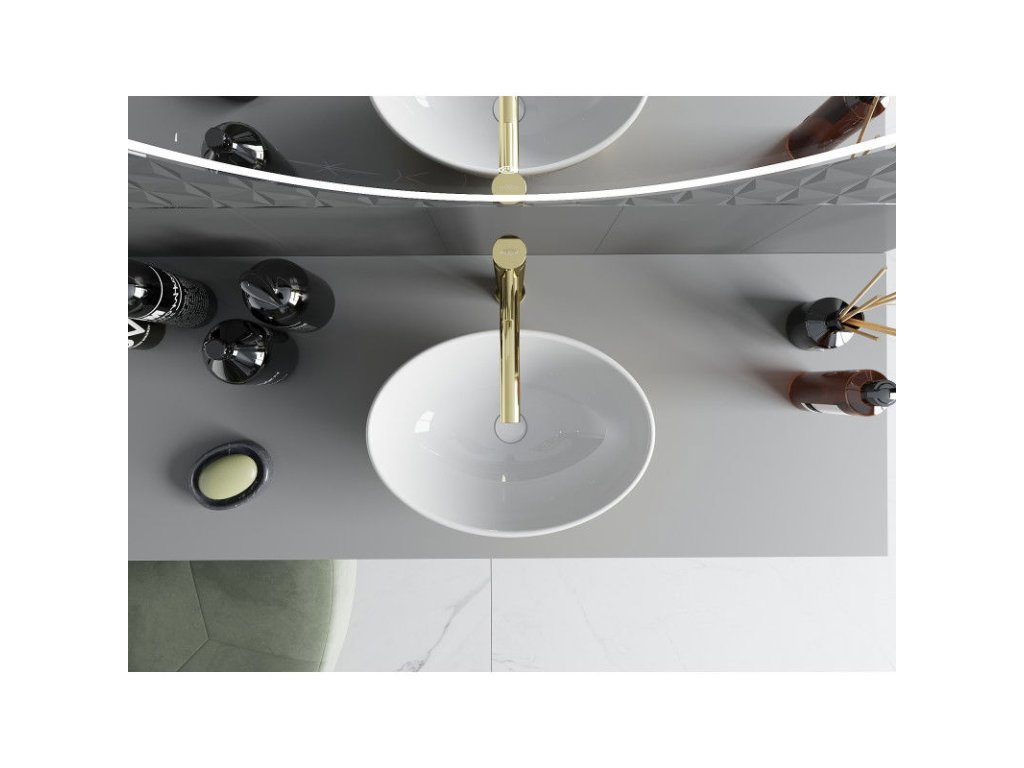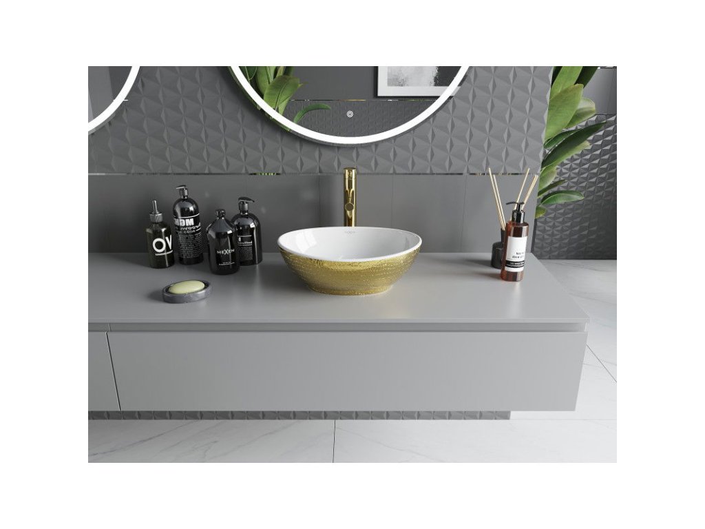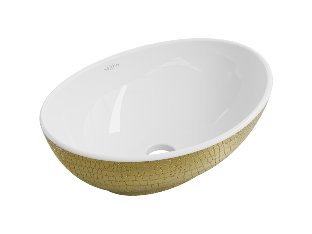 Vyberte si umývadlo na dosku, ktoré spája eleganciu s funkčnosťou. Výrobok má oválny tvar a lesklý povrch v bielej farbe so vzorom zlatej šupiny. S rozmermi 40,5 x 33 cm a výškou 14 cm sa dokonale hodí do moderných interiérov. Je vyrobený zo sanitárnej keramiky, čo zaručuje odolnosť a jednoduché čistenie. Okrem toho absencia otvorov na batériu a prepadu jej dodáva minimalistický charakter. Ideálna voľba do štýlových kúpeľňových podmienok.Dodatočné parametre