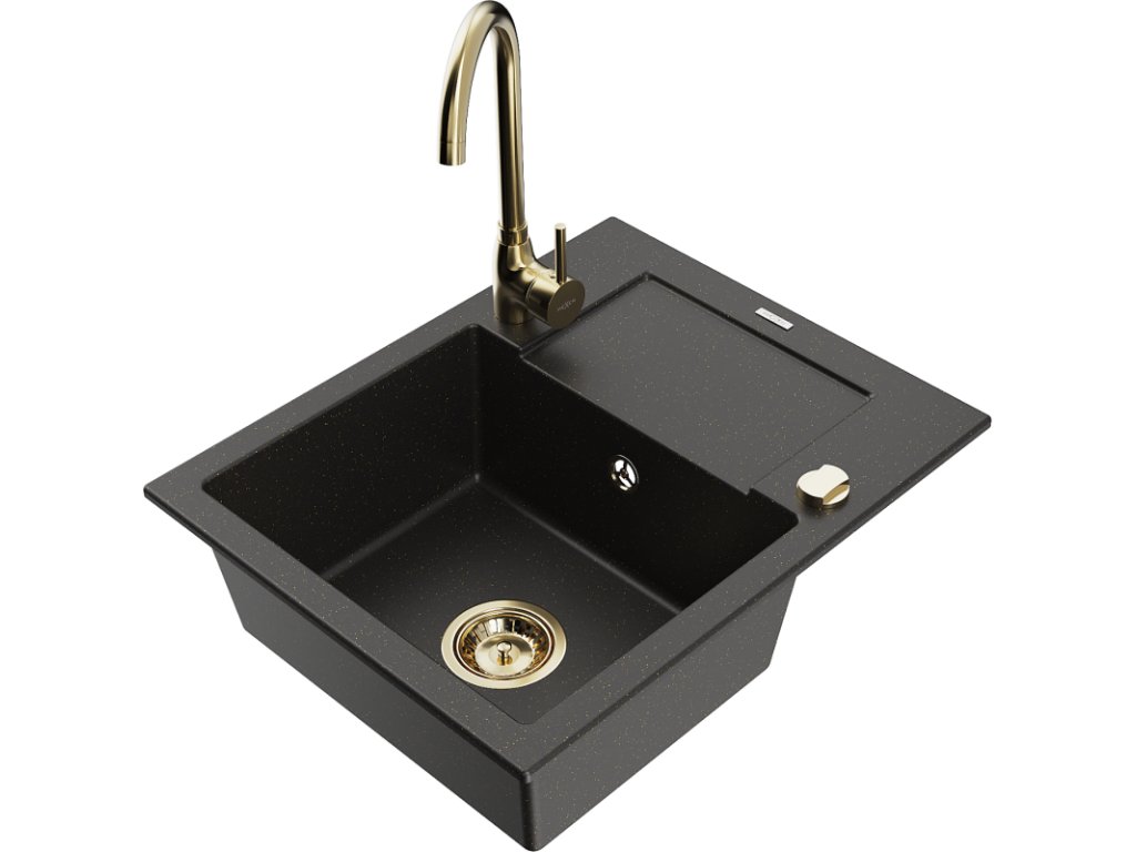 Mexen Enzo drez granitový 1-komorový s odkvapkávačom + batéria Telma, čierny/zlatý - 6506-75-670200-50