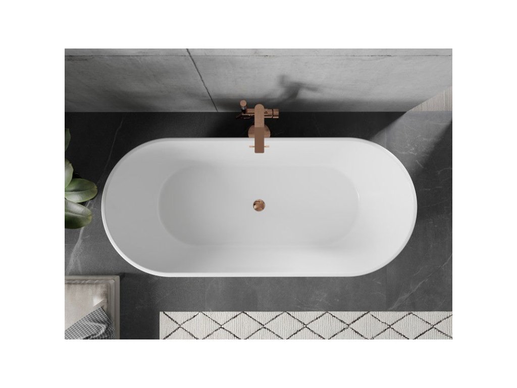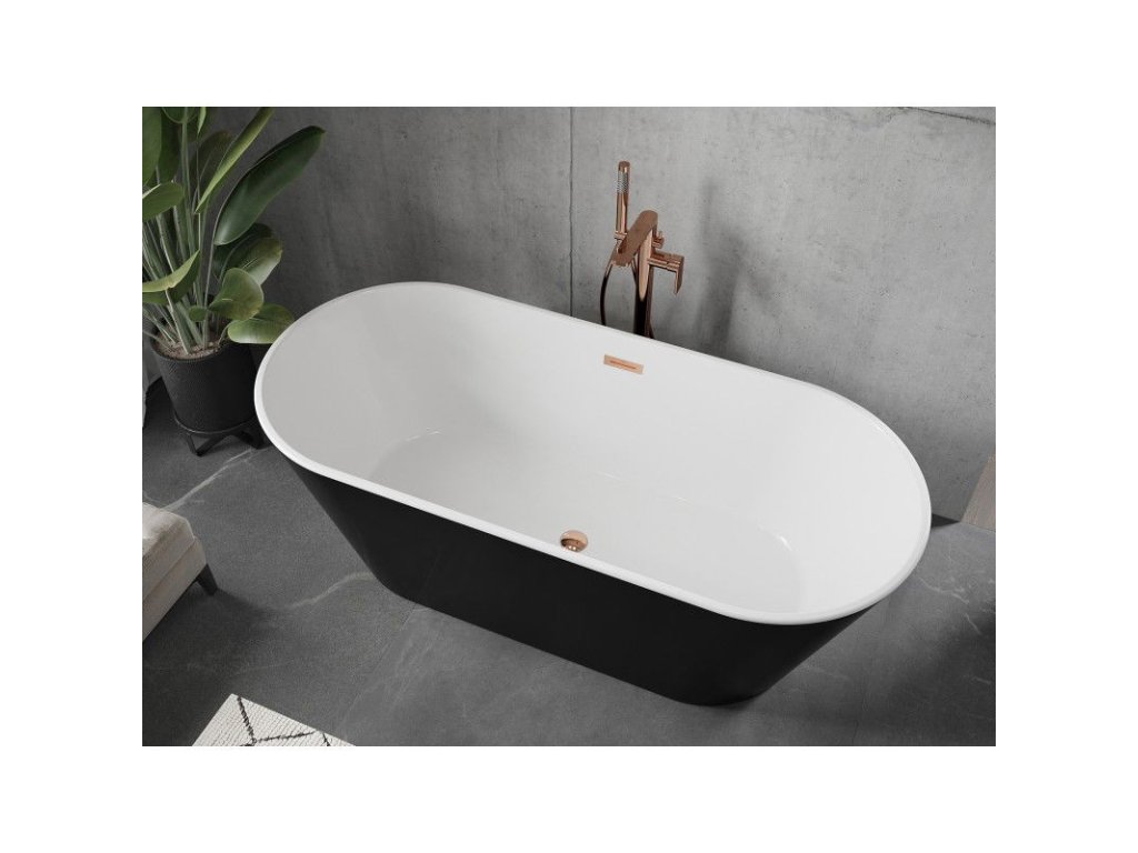 Voľne stojaca vaňa má elegantný oválny tvar a modernú povrchovú úpravu v bielej a čiernej farbe s ružovozlatými akcentmi. S rozmermi 170 x 75 cm a výškou 58 cm zaručuje pohodlné používanie. Je vyrobená zo sanitárneho akrylátu a je odolná voči dechtovaniu a UV žiareniu. Vaňa má praktický prepadový otvor a odtok v strede. Dodáva sa spolu so sifónom a zátkou click clack, vďaka čomu je ideálna do každého moderného interiéru.Dodatočné parametre
