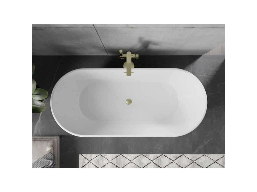Mexen Flavia je voľne stojaca vaňa s rozmermi 170 x 75 cm, ktorá spája eleganciu s funkčnosťou. Je vyrobená zo sanitárneho akrylátu a vďaka odolnosti voči zmatneniu a UV žiareniu poskytuje dlhotrvajúci lesk. Jej oválny tvar a kombinácia bielej a čiernej farby prináša moderný štýl do každej kúpeľne. Vaňa je vybavená prepadom a sifónom so zátkou click clack, vďaka čomu je pripravená na inštaláciu bez ďalšieho príslušenstva. Povrchová úprava z brúseného zlata dodáva luxusný nádych.Dodatočné parametre