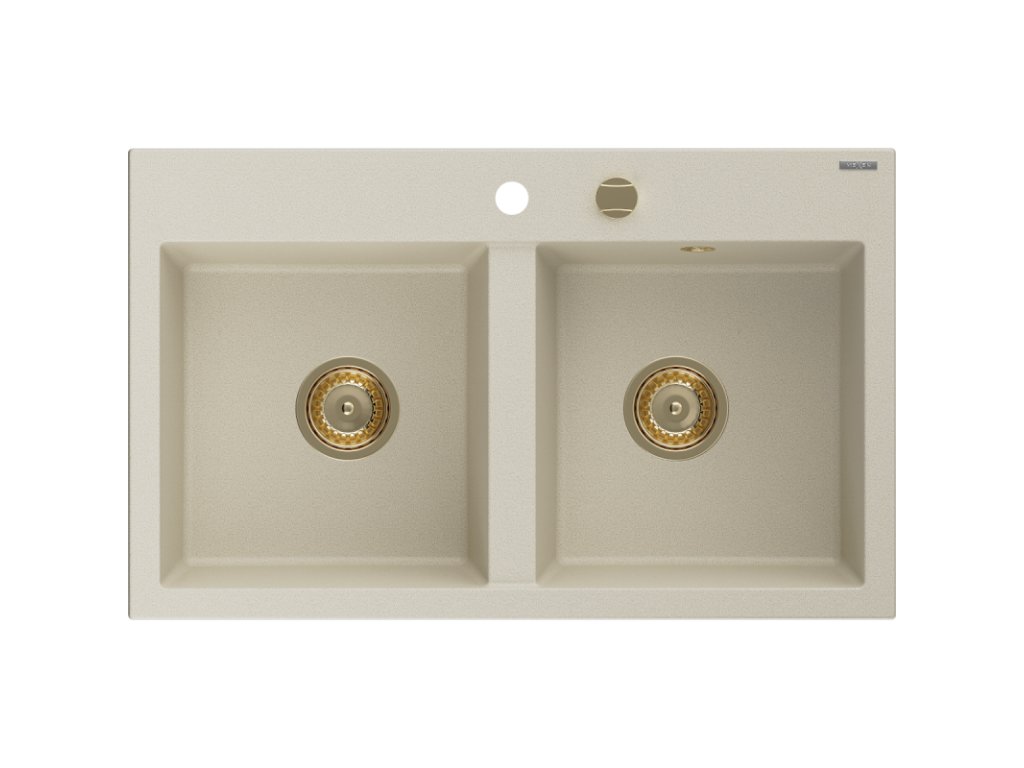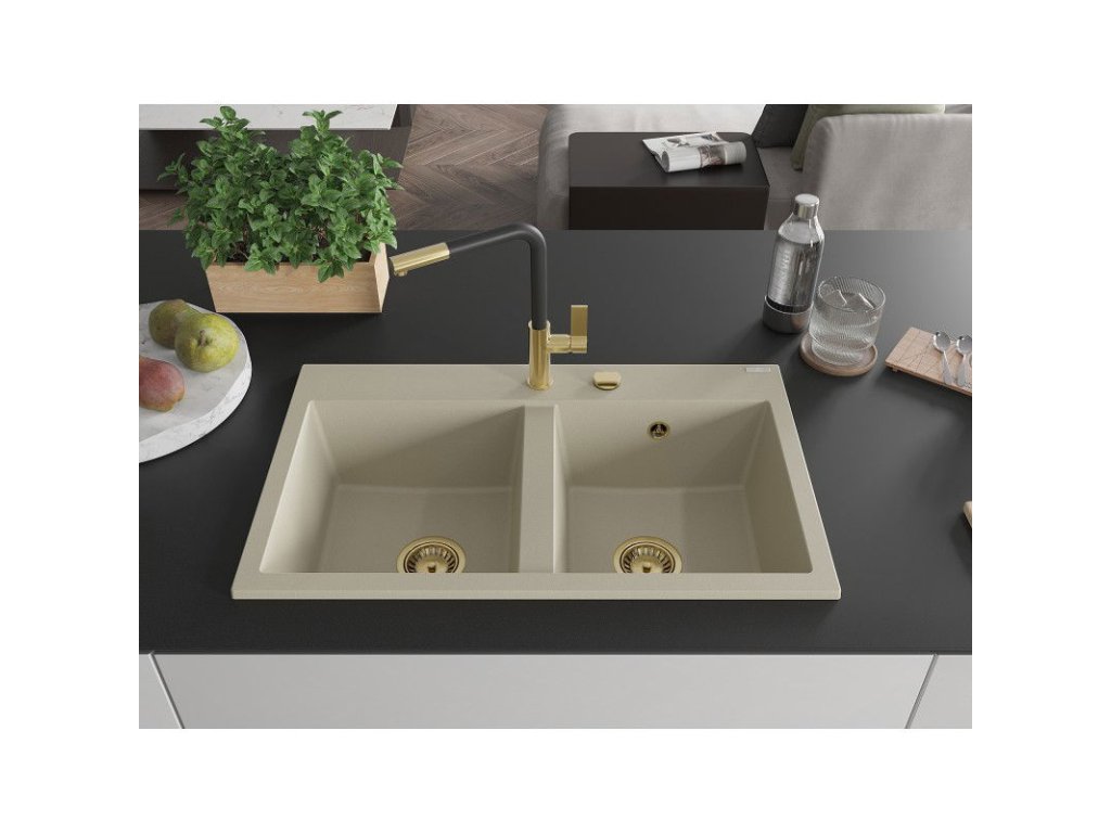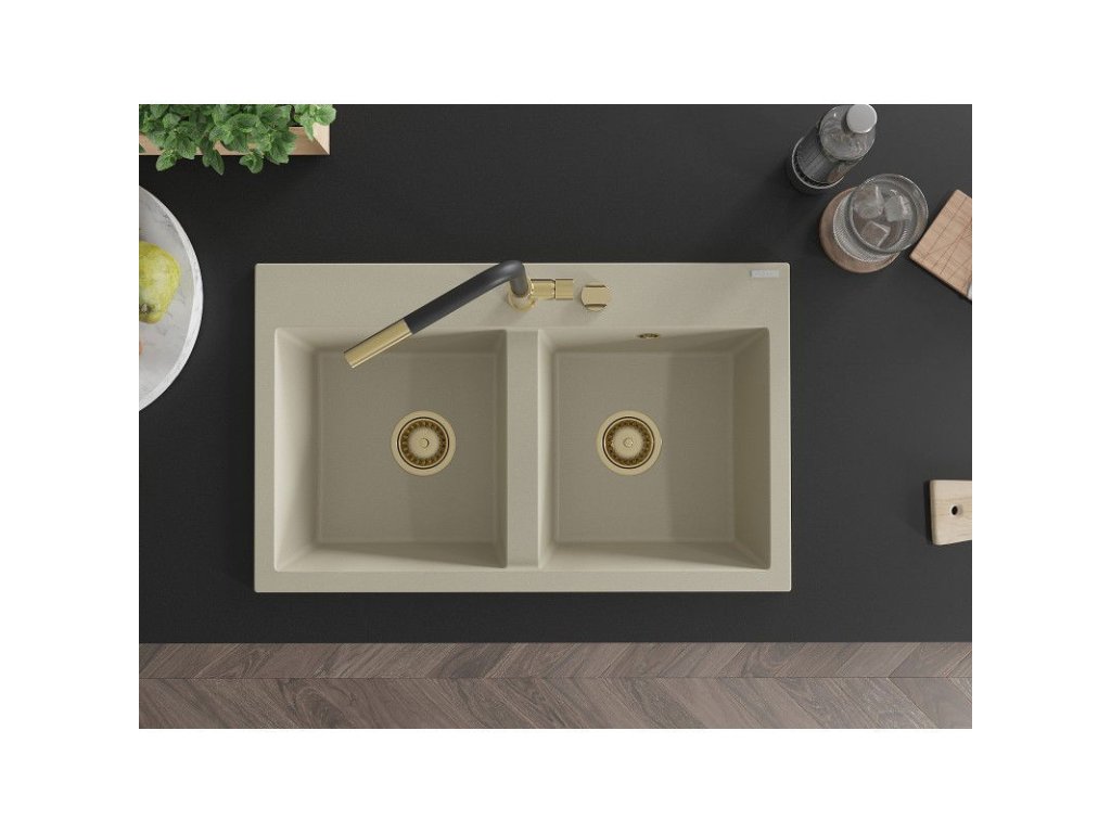 Mexen Hektor 2-komorový granitový drez 800 x 480 mm, béžový, zlatý sifón - 6521802000-69-G
