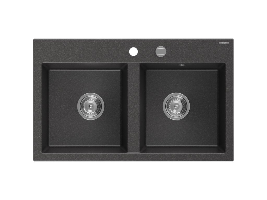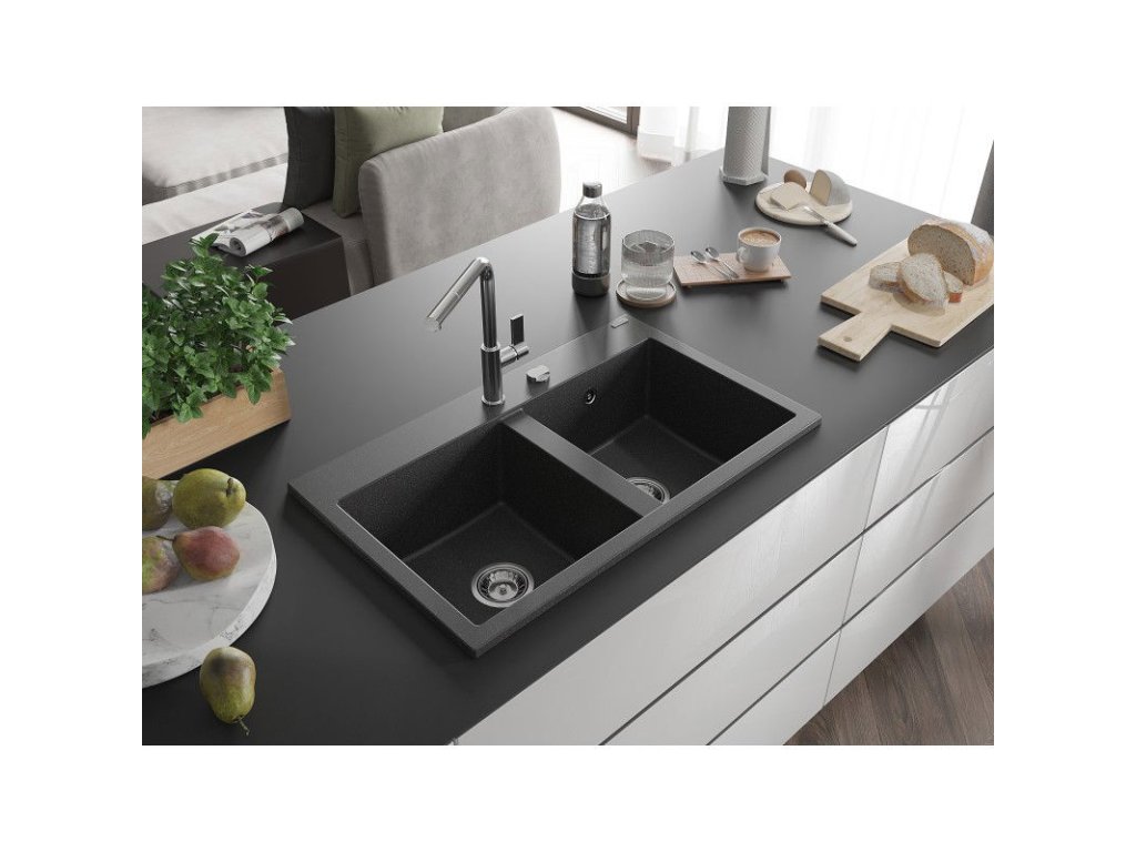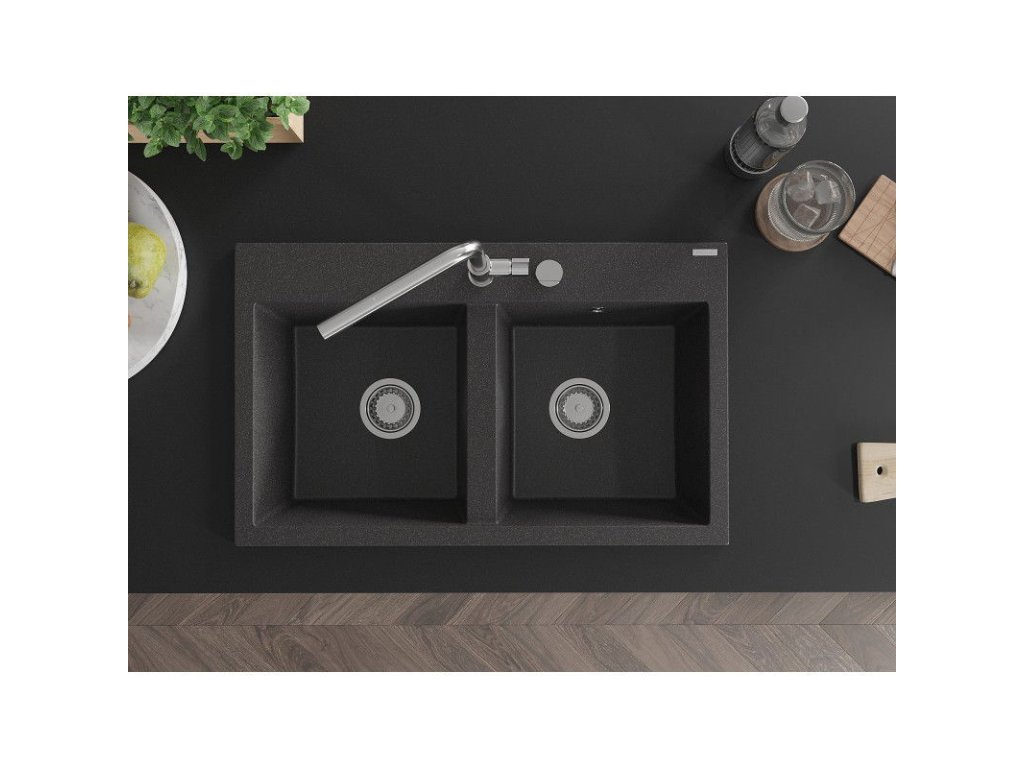 Mexen Hektor 2-komorový granitový drez 800 x 480 mm, čierny bodkovaný, chrómový sifón - 6521802000-76