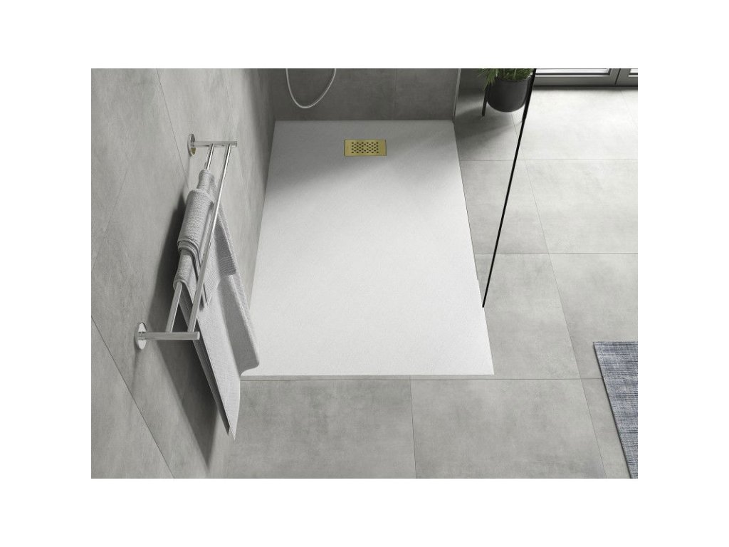 Obdĺžniková sprchová vanička Hugo je ideálnym riešením do každej kúpeľne. Jej rozmery 140 × 90 cm a mimoriadne tenký dizajn (výška len 2,6 cm) umožňujú jednoduchú inštaláciu do podlahy aj na podlahu. Sprchová vanička je vyrobená z odolného materiálu SMC, vyznačuje sa vysokou odolnosťou proti nárazom a nedeformuje sa. Okrem toho vďaka kamennej štruktúre predstavuje elegantný vzhľad. Súčasťou balenia je sifón s horným čistením, ako aj zlatý odtokový rámik s priemerom 90 mm, ktorý podčiarkuje jej luxusný vzhľad.Dodatočné parametre
