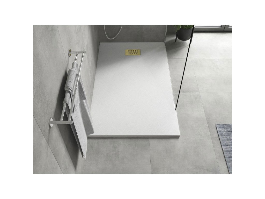 Obdĺžniková sprchová vanička Hugo s rozmermi 160x80 cm spája eleganciu s funkčnosťou. Jej biela farba a zlatá mriežka jej dodávajú moderný vzhľad. Je vyrobená z odolného plastu SMC a je odolná voči deformácii a poškodeniu. Vďaka možnosti orezania dokonale zapadne do každého interiéru. Nízky 2,6 cm profil zabezpečuje ľahký prístup a horný čistiaci sifón uľahčuje údržbu. Odtok s priemerom 90 mm zabezpečuje účinný odtok vody, vďaka čomu je ideálnou voľbou do každej kúpeľne.Dodatočné parametre