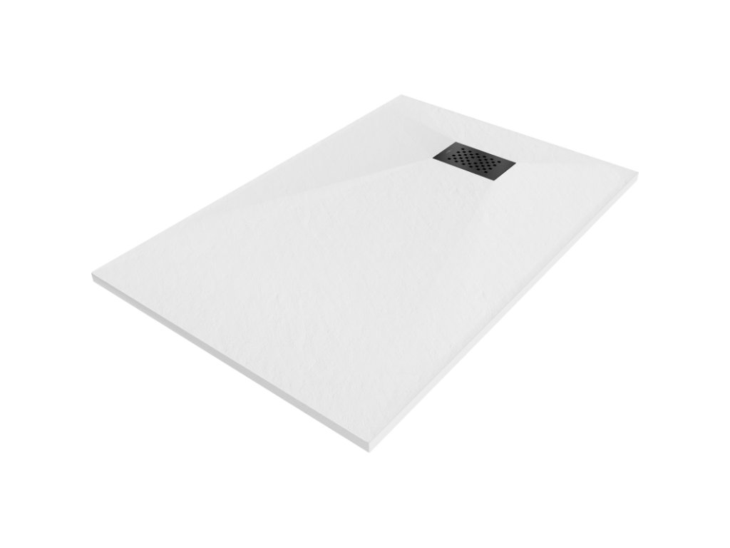 Obdĺžniková sprchová vanička Mexen Hugo má rozmery 90 x 70 cm a je vyrobená z odolného plastu SMC pre maximálnu stabilitu a odolnosť proti nárazom. Vďaka svojmu ultratenkému profilu (2,6 cm) je ideálna na inštaláciu do podlahy alebo na podlahu. Má elegantný biely povrch s kamennou textúrou a čierny kryt odtoku s priemerom 90 mm. Súčasťou balenia je sifón s horným čistením na jednoduchú údržbu.Dodatočné parametre