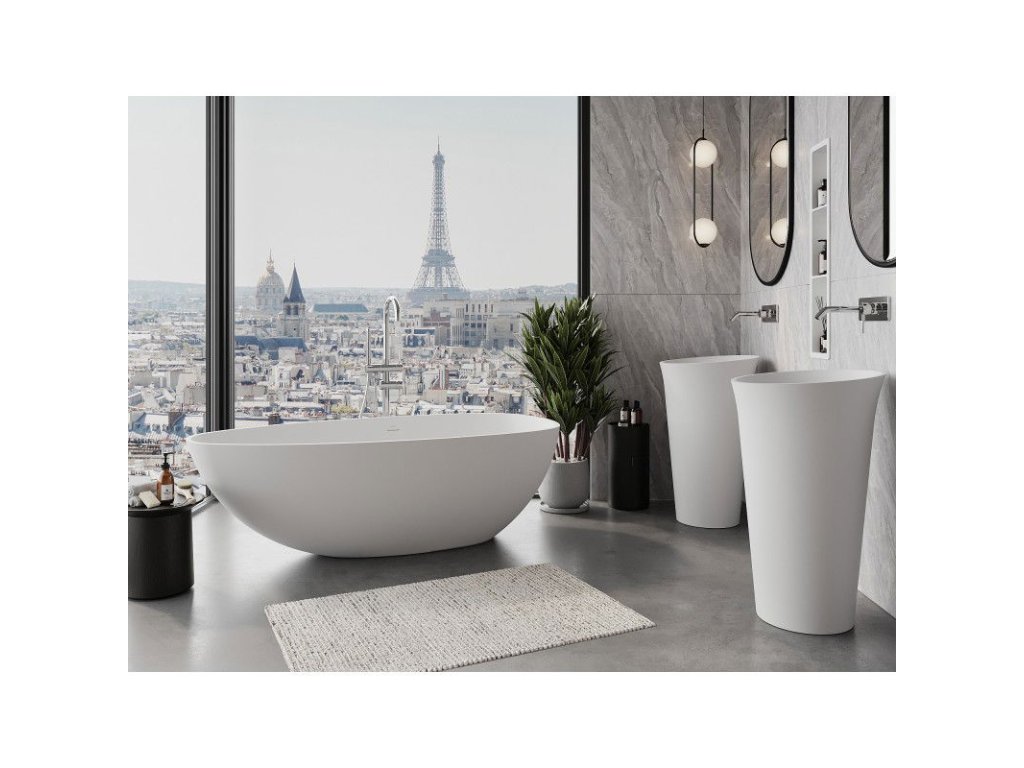 Voľne stojaca konglomerátová vaňa Mexen Imola 170 x 88 cm, biela matná je ideálnou voľbou do moderných kúpeľní. Jej oválny tvar a biely matný povrch jej dodávajú eleganciu a štýl. Vaňa má rozmery 170 x 88 cm, výšku 54 cm a hĺbku 42,5 cm. Výrobok je odolný voči zmatneniu a UV žiareniu. Okrem toho má prepadový otvor a odtok je umiestnený uprostred. Pre väčšie pohodlie je súčasťou balenia sifón a zátka click clack.Dodatočné parametre