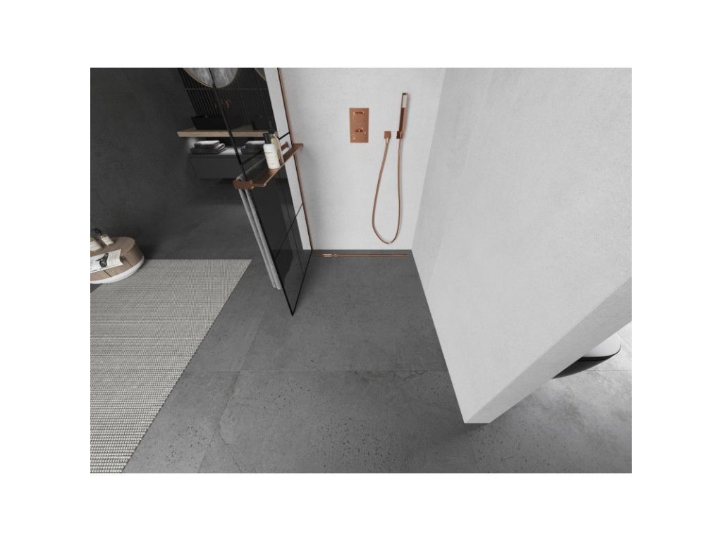Mexen Kioto+ L sprchová stena s policou 70 x 200 cm, čierny dizajn, brúsená meď - 800-070-123-65-77