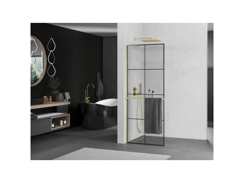Mexen Kioto+ L sprchová stena s policou 80 x 200 cm, čierny vzor, brúsené zlato - 800-080-123-55-77