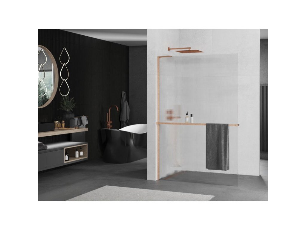 Mexen Kioto+ L sprchová stena s policou 90 x 200 cm, pruh, brúsená meď - 800-090-123-65-09