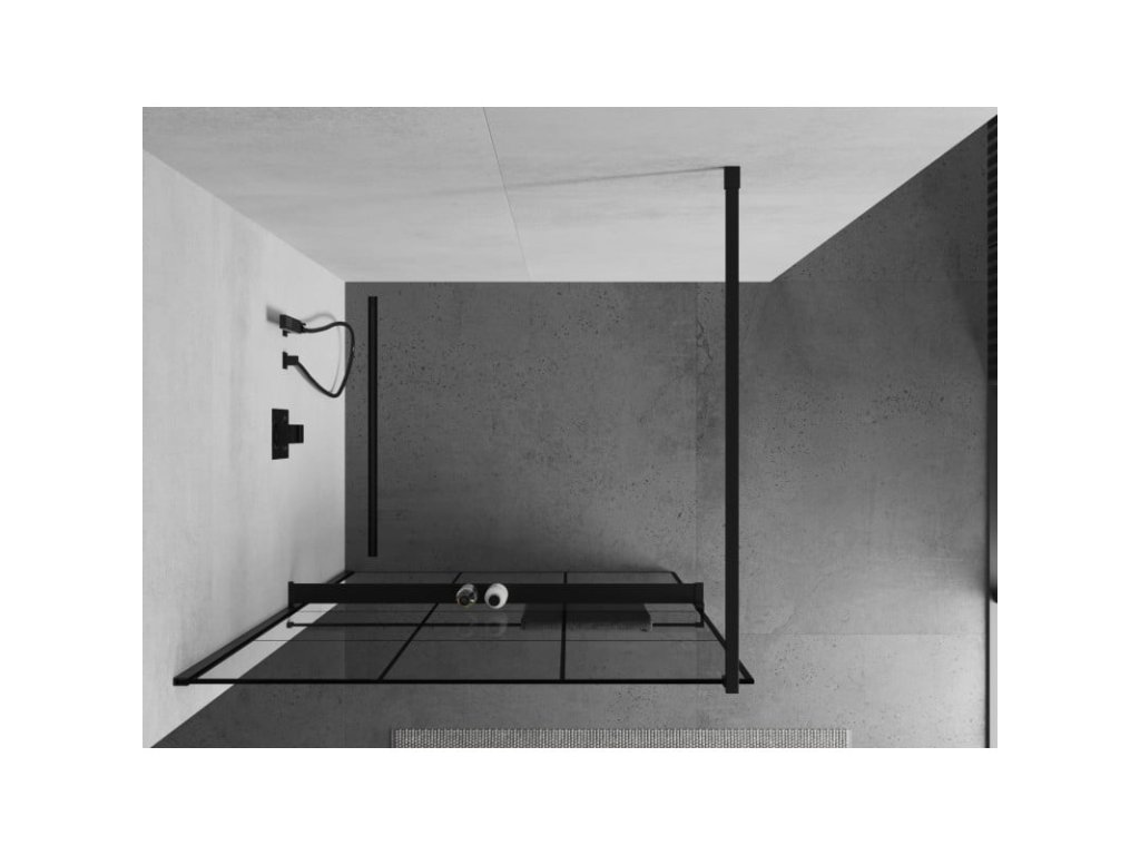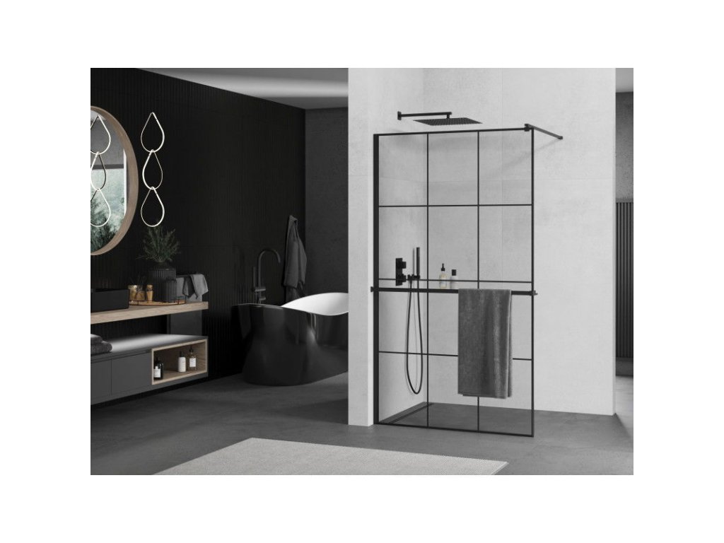 Mexen Kioto sprchová zástena s držiakom na uteráky a poličkou 100 x 200 cm, priehľadné sklo / čierny vzor, 8 mm, čierna - 800-100-121-70-77