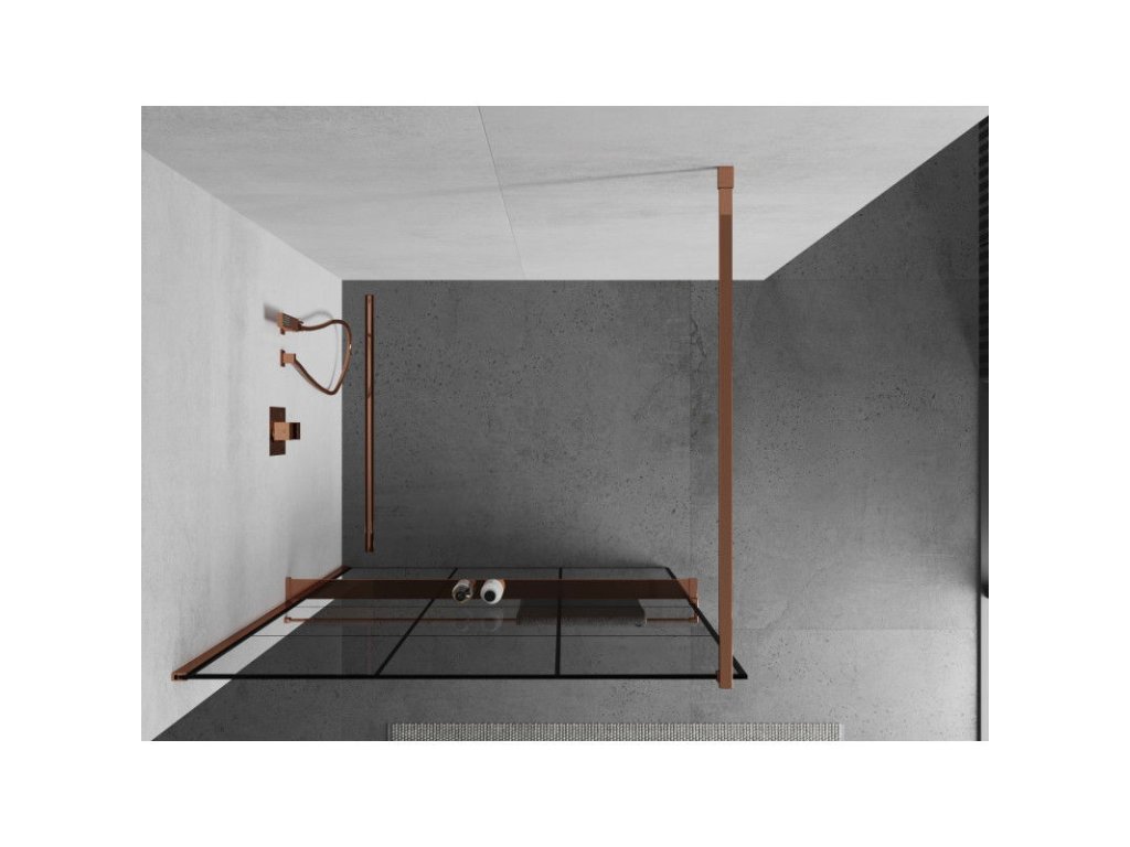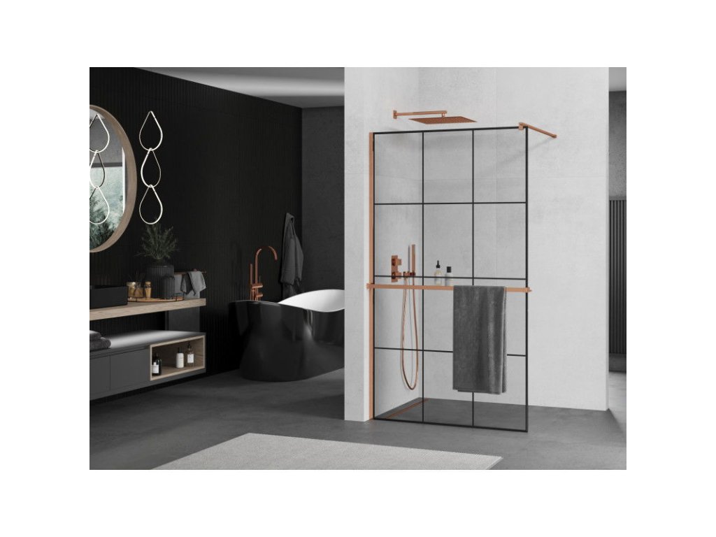 Mexen Kioto sprchová zástena s držiakom na uteráky a poličkou 110 x 200 cm, priehľadné sklo / čierny vzor, 8 mm ružové zlato - 800-110-121-60-77