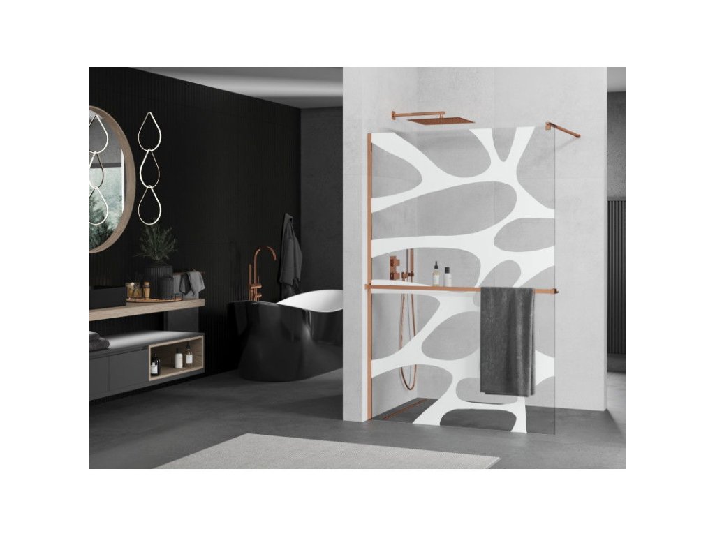 Mexen Kioto sprchová zástena s držiakom na uteráky a poličkou 140 x 200 cm, priehľadné sklo / biely vzor, 8 mm, ružové zlato - 800-140-121-60-97