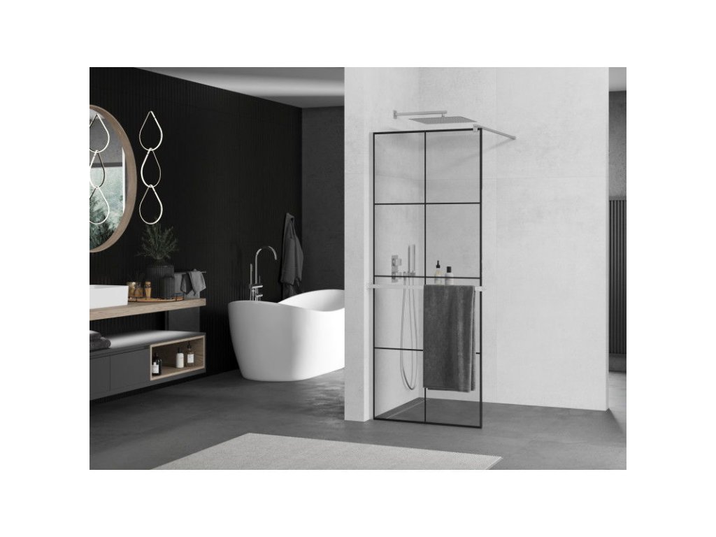 Mexen Kioto sprchová zástena s držiakom na uteráky a poličkou 80 x 200 cm, priehľadné sklo / čierny vzor, 8 mm, chróm - 800-080-121-01-77