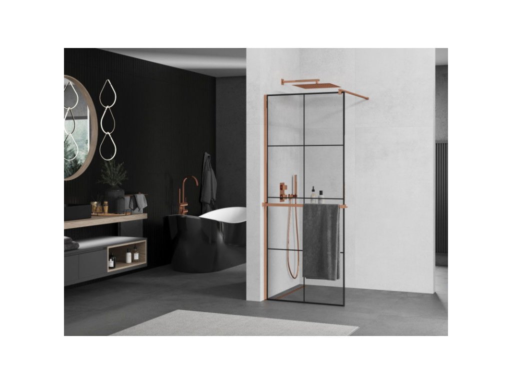 Mexen Kioto sprchová zástena s držiakom na uteráky a poličkou 90 x 200 cm, priehľadné sklo / čierny vzor, 8 mm ružové zlato - 800-090-121-60-77
