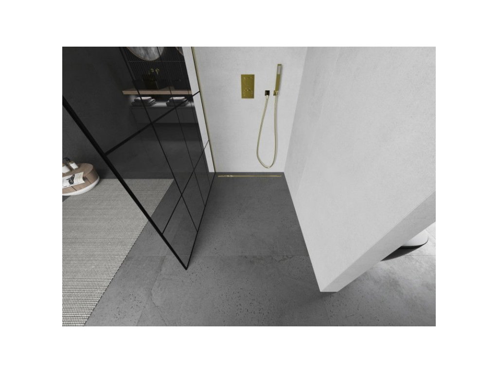 Mexen Kioto sprchová zástena 140 x 200 cm, priehľadné sklo / čierny vzor, 8 mm, zlatá - 800-140-101-50-77
