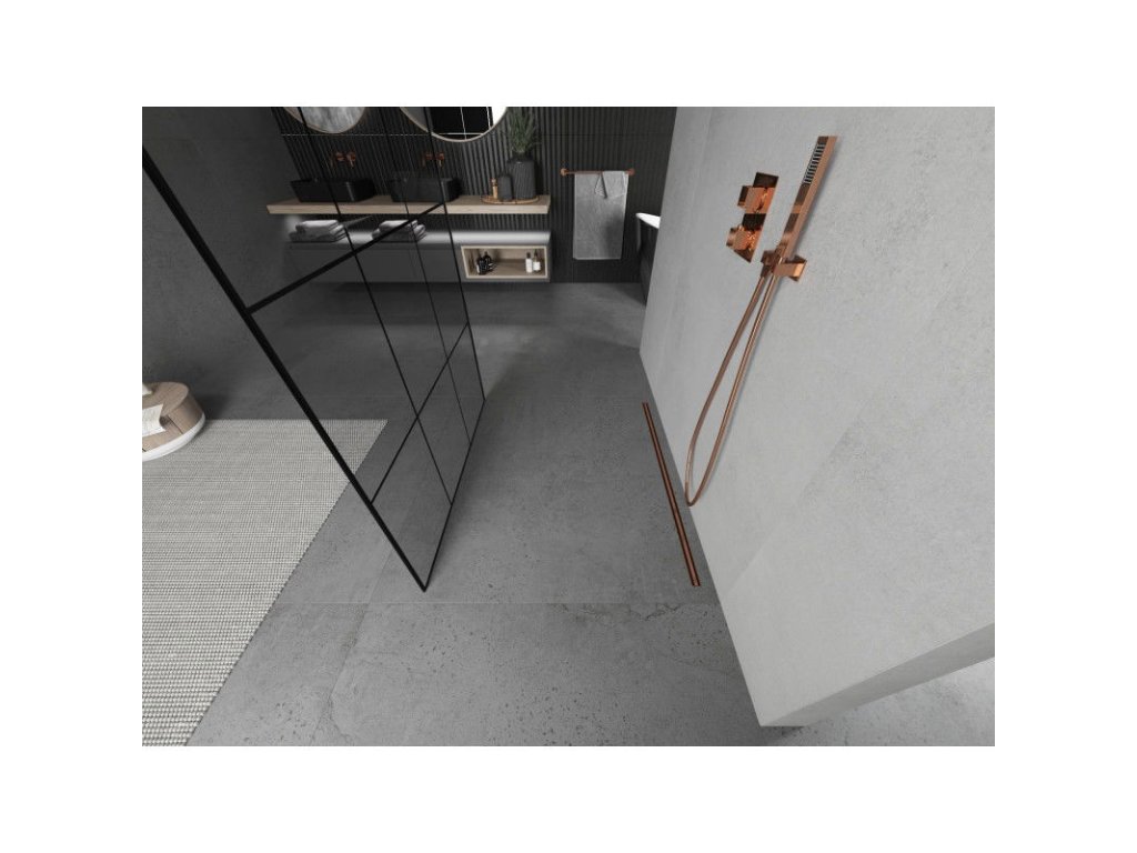 Mexen Kioto sprchová zástena voľne stojaca 110 x 200 cm, priehľadné sklo / čierny vzor, 8 mm, ružové zlato - 800-110-002-60-77
