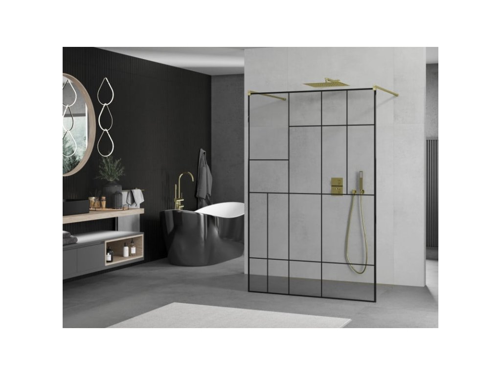 Mexen Kioto sprchová zástena voľne stojaca 110 x 200 cm, priehľadné sklo / čierny vzor, 8 mm, zlatá - 800-110-002-50-78