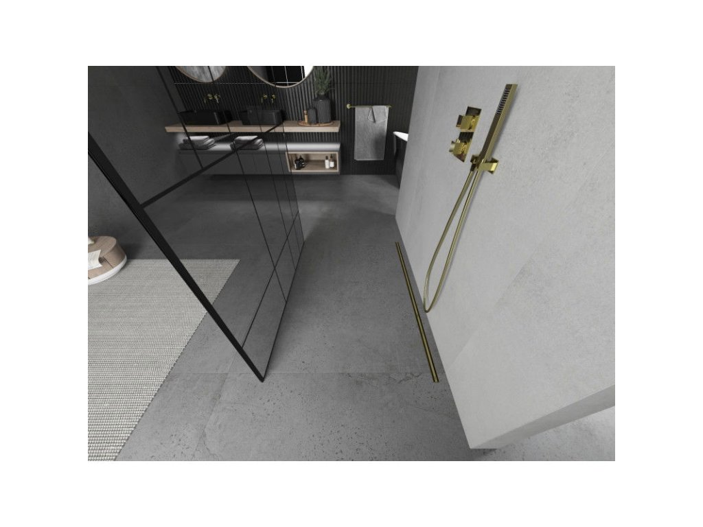 Mexen Kioto sprchová zástena voľne stojaca 130 x 200 cm, priehľadné sklo / čierny vzor, 8 mm, zlatá - 800-130-002-50-78