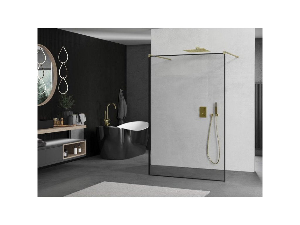 Mexen Kioto voľne stojaca sprchová stena 100 x 200 cm, 8 mm čierny vzor, brúsené zlato - 800-100-002-55-70