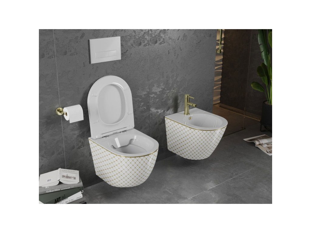 Mexen Lena WC misa bez okrajov so štíhlym voľne stojacim sedadlom, duroplast, bielo-zlatý mriežkový vzor - 30224009