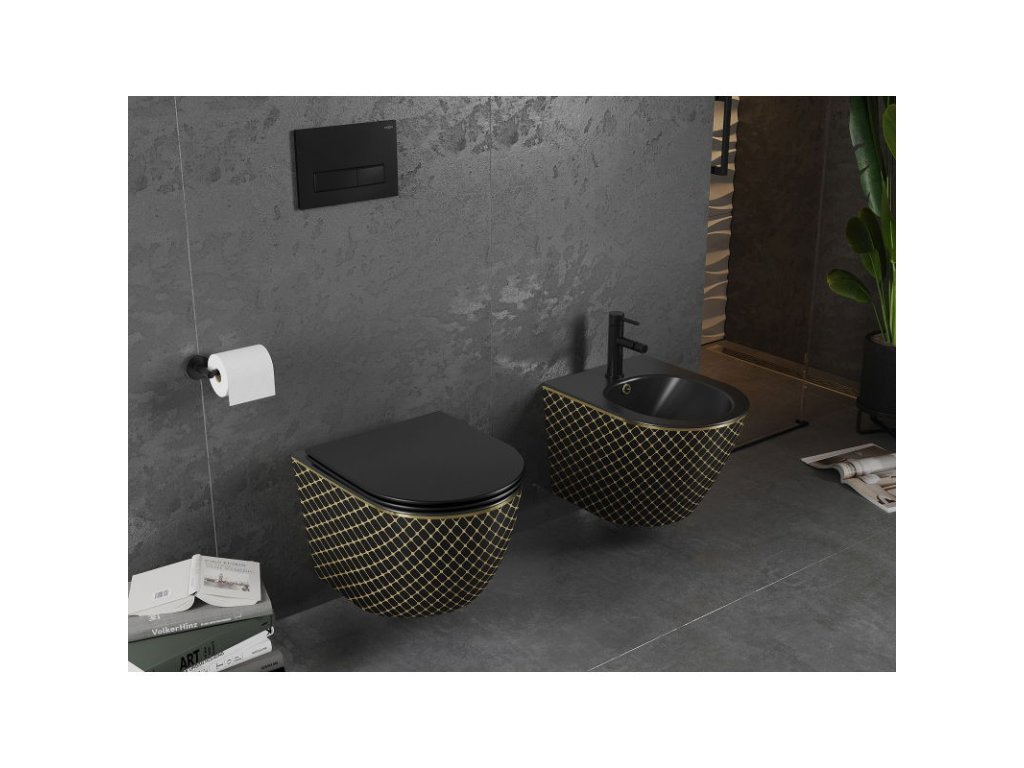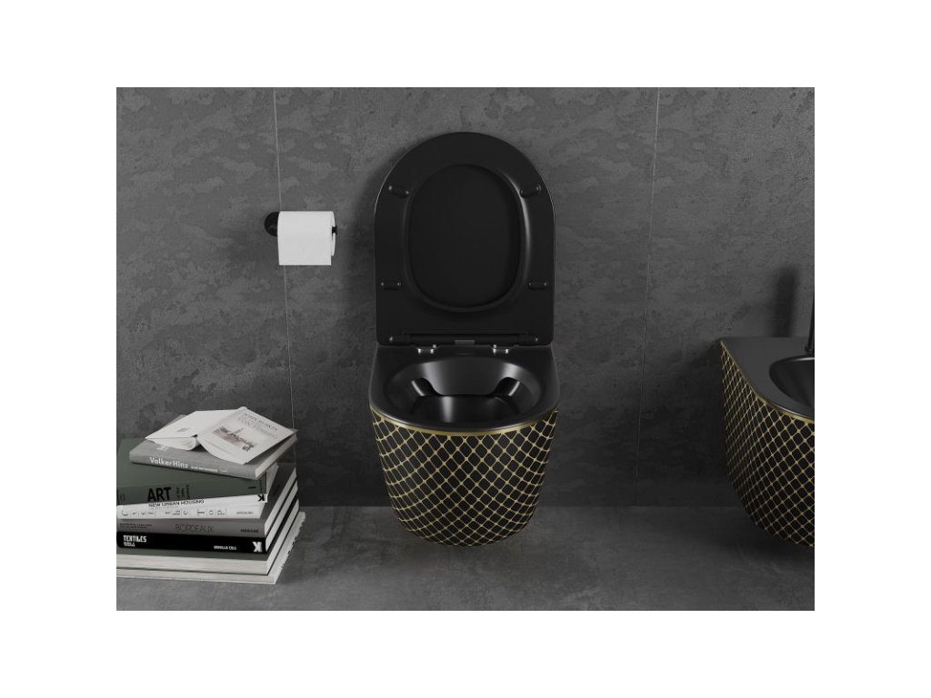 Mexen Lena WC misa bez okrajov so štíhlym voľne stojacim sedadlom, duroplast, čierny matný/zlatý mriežkový vzor - 30224079