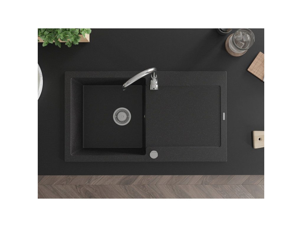 \nTechnické údaje: \n \nrozmery: 900x500x190 mm \n \nhĺbka komory: 180 mm \n \nrozmery komory: 430x415 mm \n \npriemer odtoku: ø90 mm \n \nmodel: 1-komorový s odkvapkávačom \n \ntyp: zapustené do pracovnej dosky \n \nfarba: čierny/strieborná metalíza \n \nmateriál: žula \n \nprepadový otvor: áno \n \notvor pre batériu: áno \n \nautomatický sifón v sade \n \nvysoká odolnosť proti poškriabaniu a zafarbeniu \n \nodolnosť proti tepelným šokom \n \npovrch pre ľahké čistenie \n \n2 predvŕtané otvory pre vlastné dierovanie ø35Dodatočné parametre