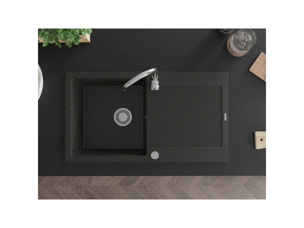 \nTechnické údaje: \n \nrozmery: 900x500x190 mm \n \nhĺbka komory: 180 mm \n \nrozmery komory: 430x415 mm \n \npriemer odtoku: ø90 mm \n \nmodel: 1-komorový s odkvapkávačom \n \ntyp: zapustené do pracovnej dosky \n \nfarba: čierny/zlatá metalíza \n \nmateriál: žula \n \nprepadový otvor: áno \n \notvor pre batériu: áno \n \nautomatický sifón v sade \n \nvysoká odolnosť proti poškriabaniu a zafarbeniu \n \nodolnosť proti tepelným šokom \n \npovrch pre ľahké čistenie \n \n2 predvŕtané otvory pre vlastné dierovanie ø35Dodatočné parametre