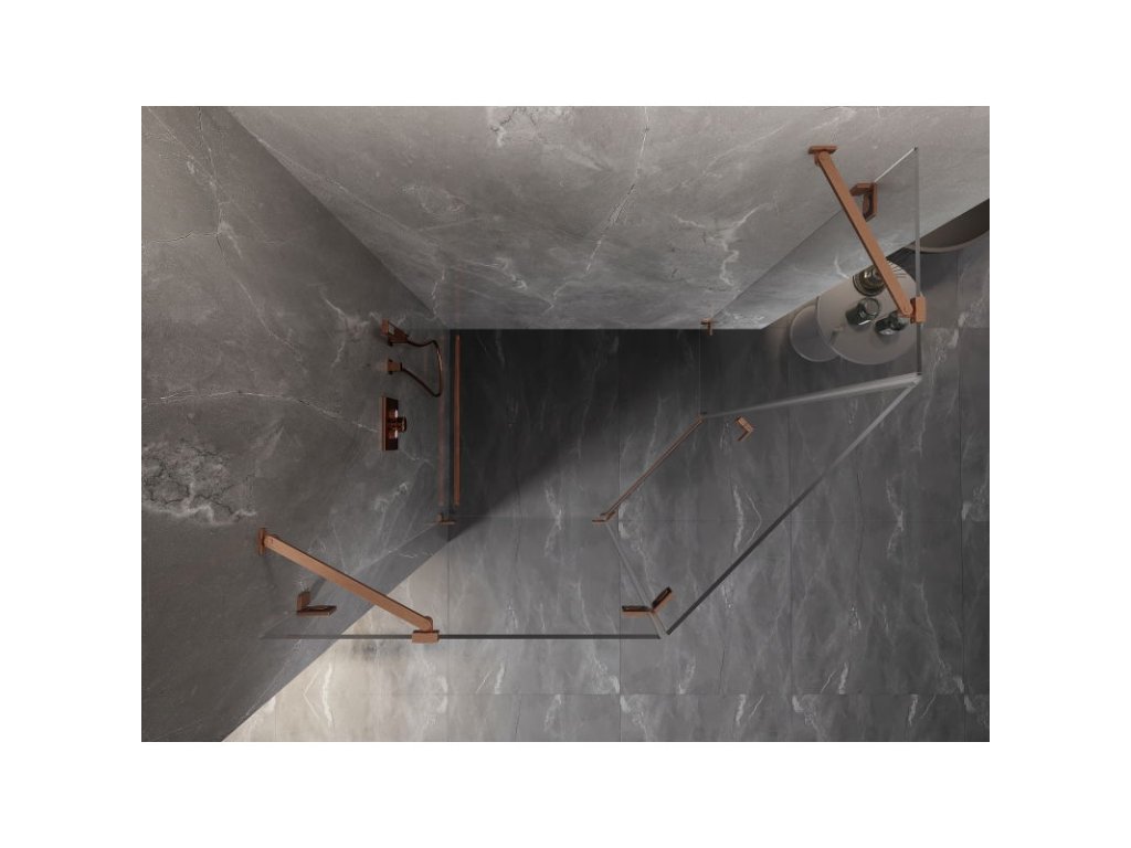 Mexen Lunar päťuholníkový sprchový kút naklápací doľava 100 x 80 cm, transparentný, brúsená meď - 831-100L-080P-65-00-L
