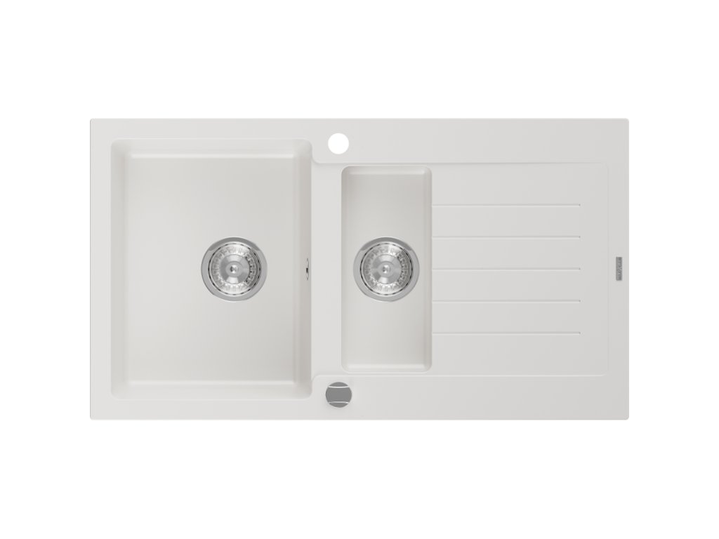 \nTechnické údaje: \n \nrozmery: 900x505x200 mm \n \nhĺbka komory: 180 mm (väčšia), 115 mm (menšia) \n \nrozmery komory: 435x335 mm (väčšia), 345x150 mm (menšia) \n \npriemer odtoku: ø90 mm \n \nModel: 1,5-komorový s krátkym odkvapkávačom \n \ntyp: zapustené do pracovnej dosky \n \nfarba: biely \n \nmateriál: žula \n \nprepadový otvor: áno \n \notvor pre batériu: áno \n \nautomatický sifón v sade \n \nvysoká odolnosť proti poškriabaniu a zafarbeniu \n \nodolnosť proti tepelným šokom \n \npovrch pre ľahké čistenie \n \n2 predvŕtané otvory pre vlastné dierovanie ø35Dodatočné parametre