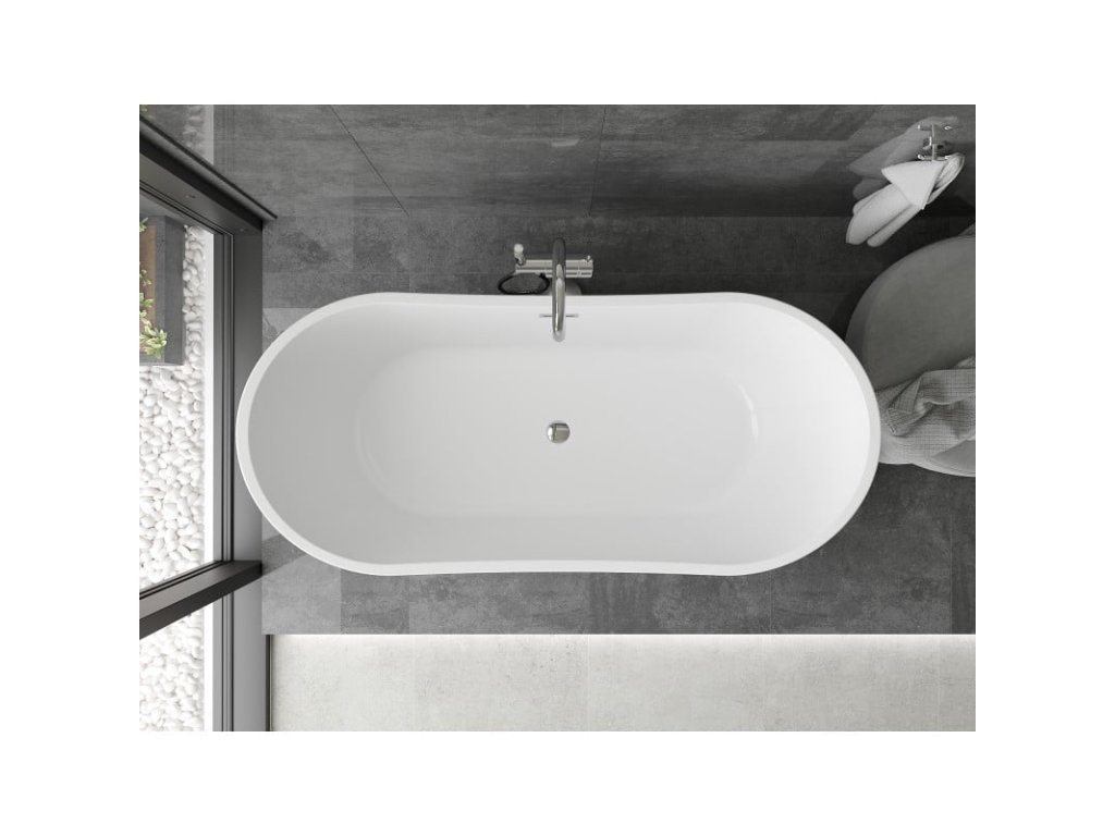 Voľne stojaca vaňa sa vyznačuje elegantným oválnym tvarom a moderným dizajnom v bielej a čiernej farbe. S rozmermi 180 x 90 cm a výškou 72 cm poskytuje pohodlie a priestrannosť. Je vyrobená zo sanitárneho akrylátu, ktorý zaručuje trvanlivosť a odolnosť proti zmatneniu a UV žiareniu. Chrómové detaily a povrch s vysokým leskom dodávajú štýl, zatiaľ čo prepadový otvor zvyšuje praktickosť. Súčasťou balenia je sifón a zátka s kliknutím, vďaka čomu je ideálnou voľbou do každého moderného interiéru.Dodatočné parametre