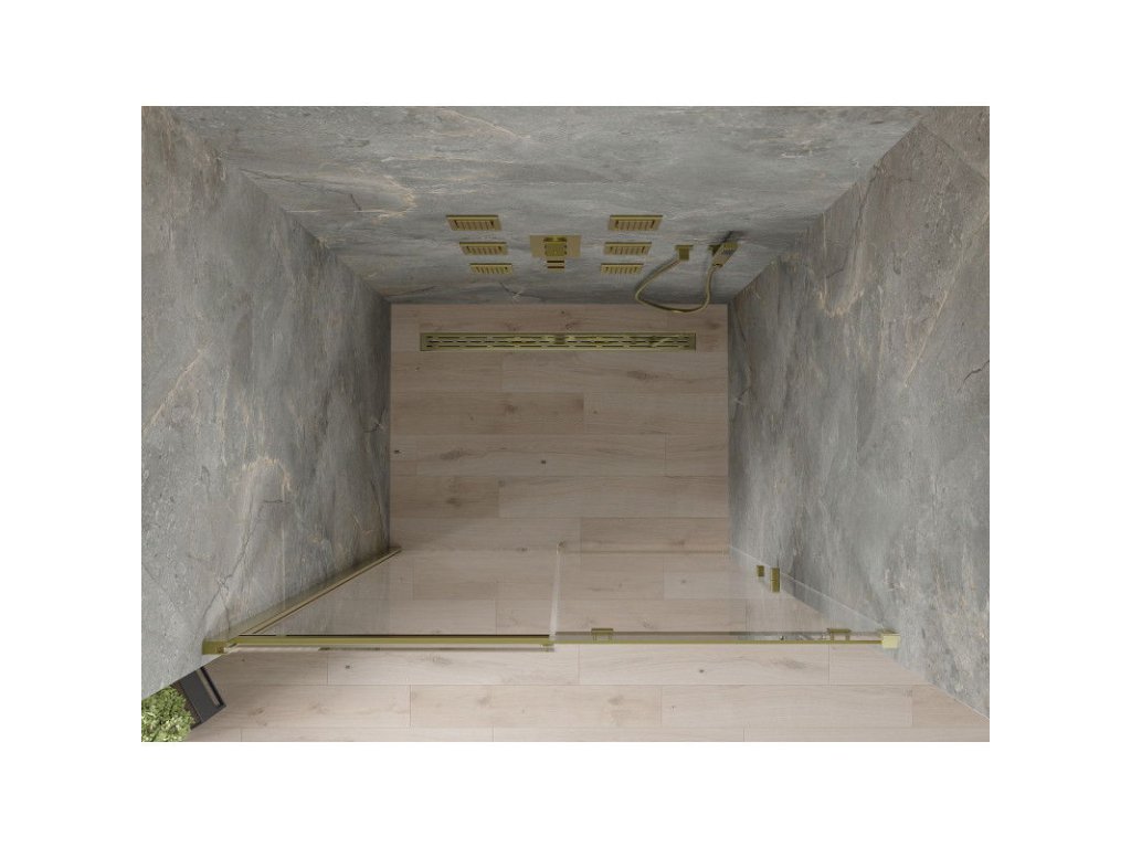 \nTechnické údaje: rozmery: 100x190 cm montáž: univerzálna Ľ+P vstup: posuvné dvere farba skla: priehľadný - transparent typ skla: tvrdené - bezpečnostné hrúbka skla: 8 mm profil: hliník povrchová úprava: zlatá lesklá povlak pre ľahké čistenie : áno vyrovnanie nerovností steny: áno nastavenie šírky: áno montáž na dlažbu alebo sprchovú vaničku: áno kovová rukoväť sada tesnení na odvod vody hliníkový prah dveríDodatočné parametre