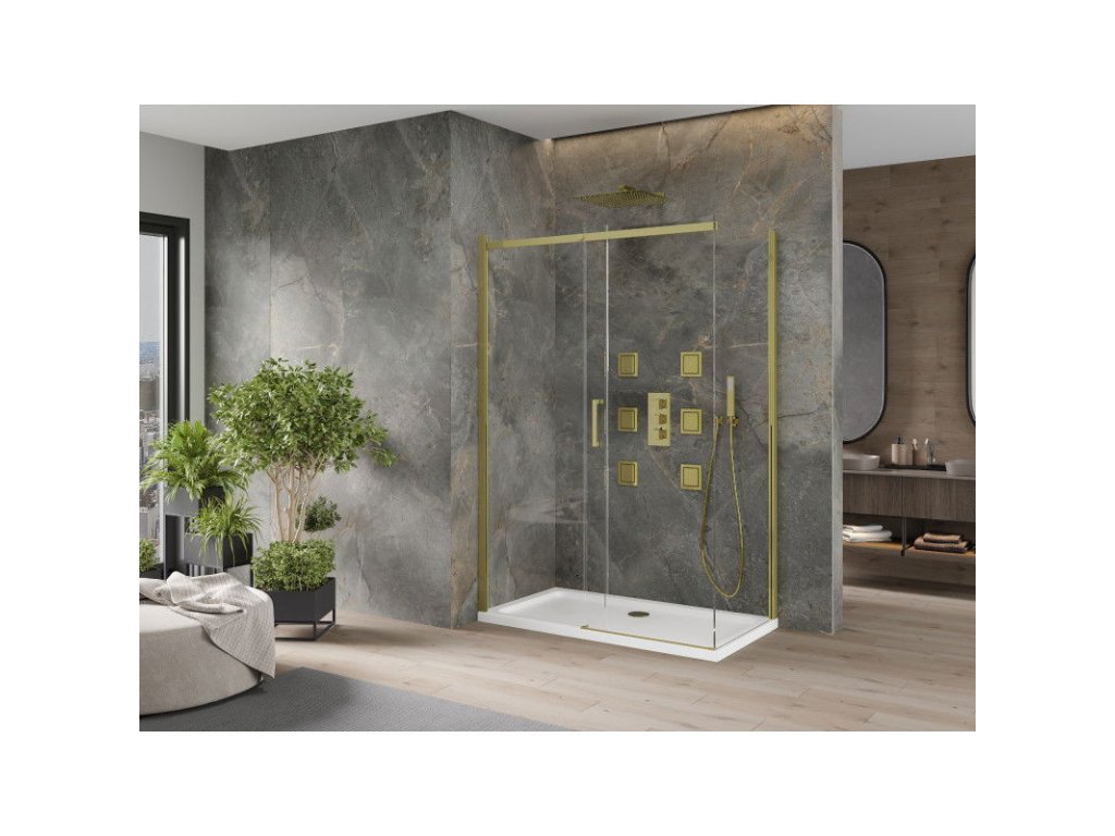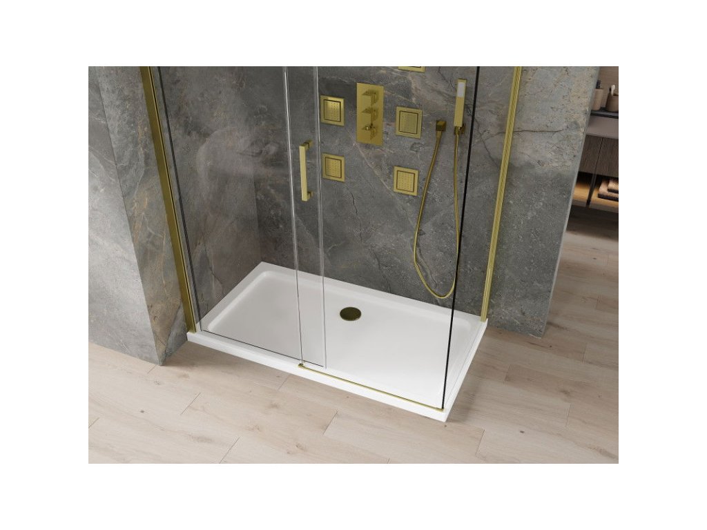 Mexen Omega sprchový kút posuvné dvere 140 x 70 cm, priehľadné sklo, profil zlatý + Flat sprchová vanička, biela - 825-140-070-50-00-4010